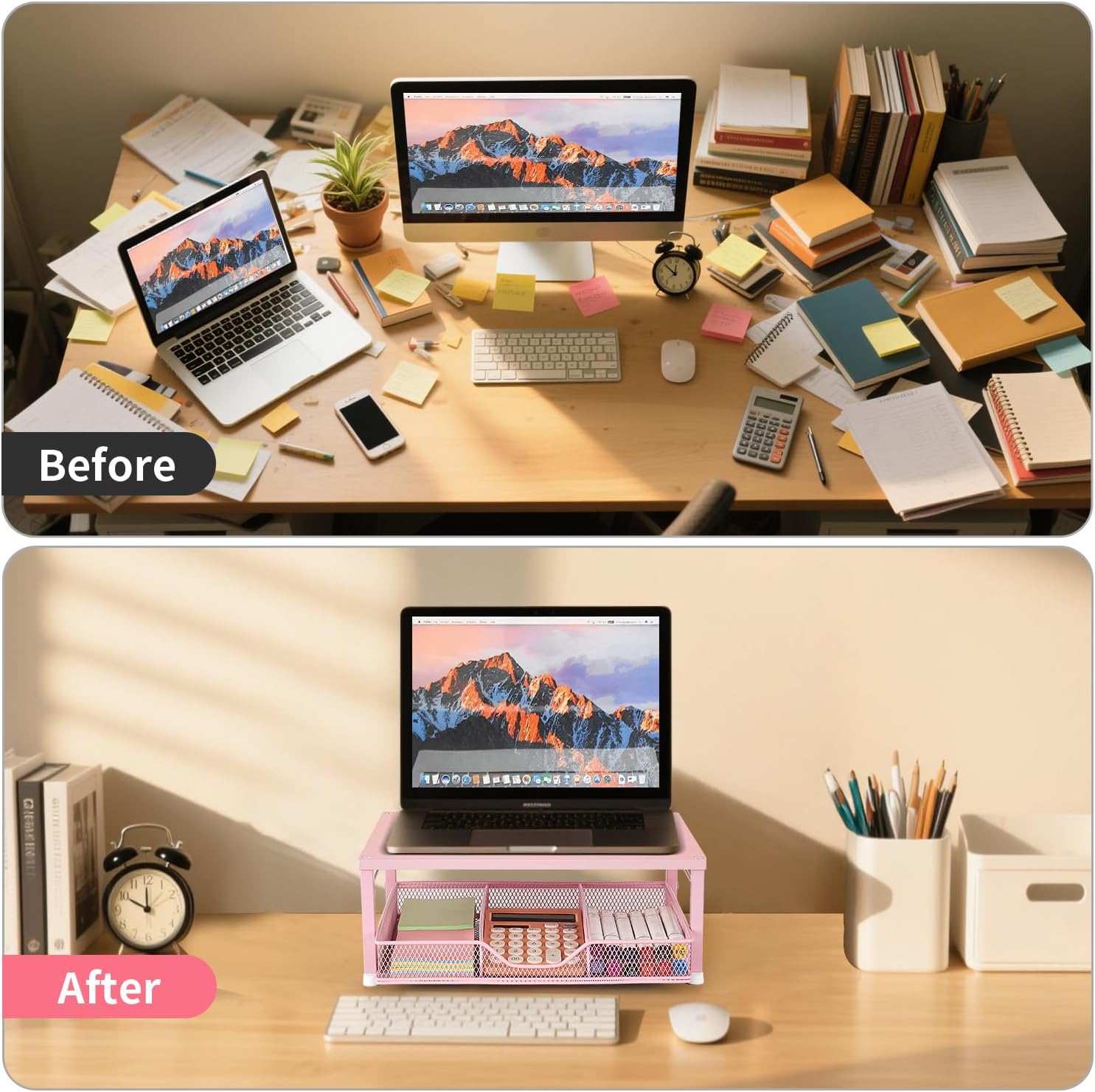 【High-Quality Material】The desktop riser is made of metal, which ensures the stability and durability of the product for a long-lasting use. Smooth surface is designed to ensure safe use and easy cleaning. As it is made of metal, it is magnetic so that it can support your magnetic items, adding more imagination to your own space with your funny magnets