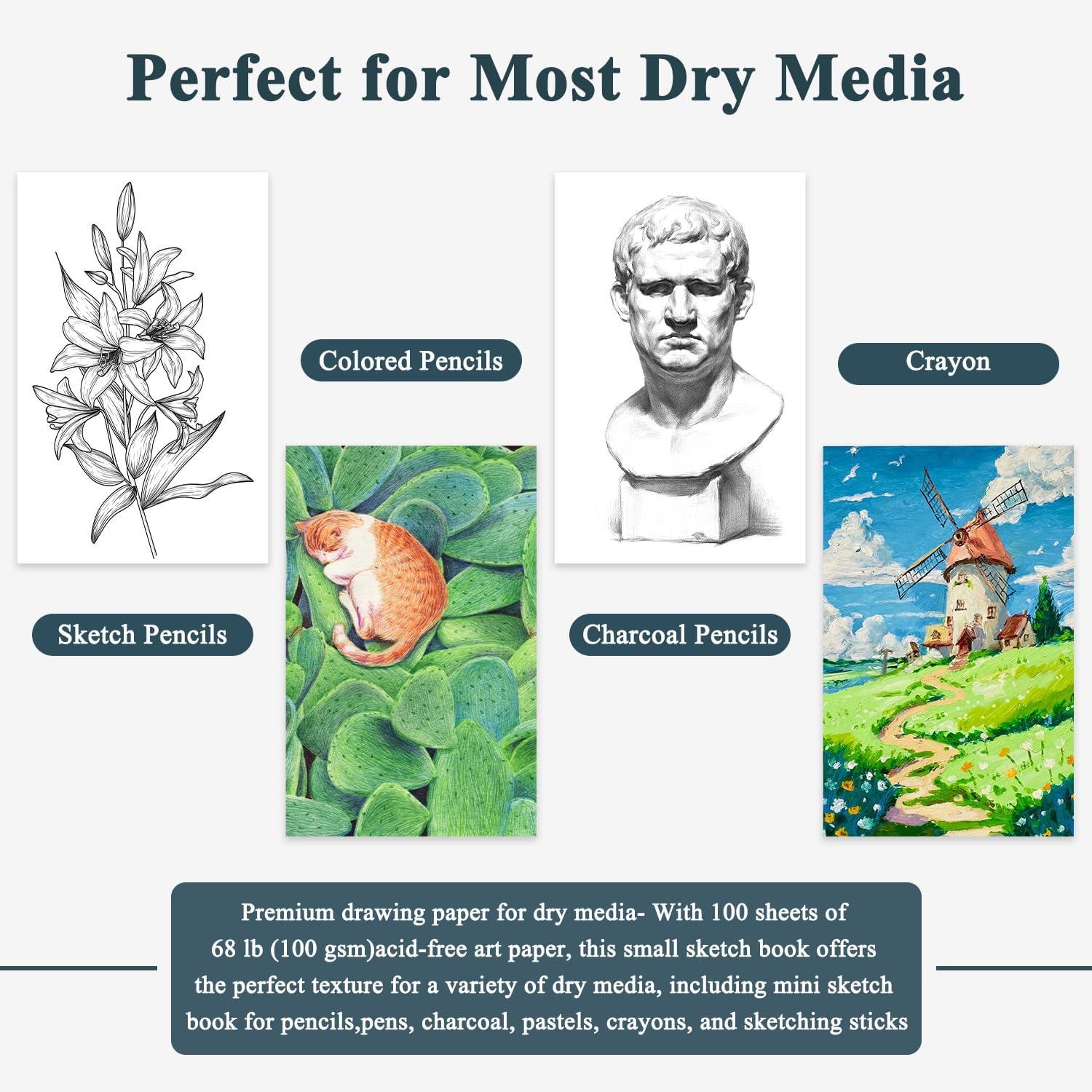【Premium & Sturdy Material】–Extremely strong toughness and durability of this sketching paper pad allows for erasing without damaging small sketchbook surface, so mini sketchbook can stand up to multiple drawings without warping or penetrating. This spiral sketchbook can be used for sketching, painting and writing. Suitable for all dry media including pencil, pen, pastels, charcoal, sketching sticks, gel pen and so on. NOT applicable to markers and Watercolor pen.