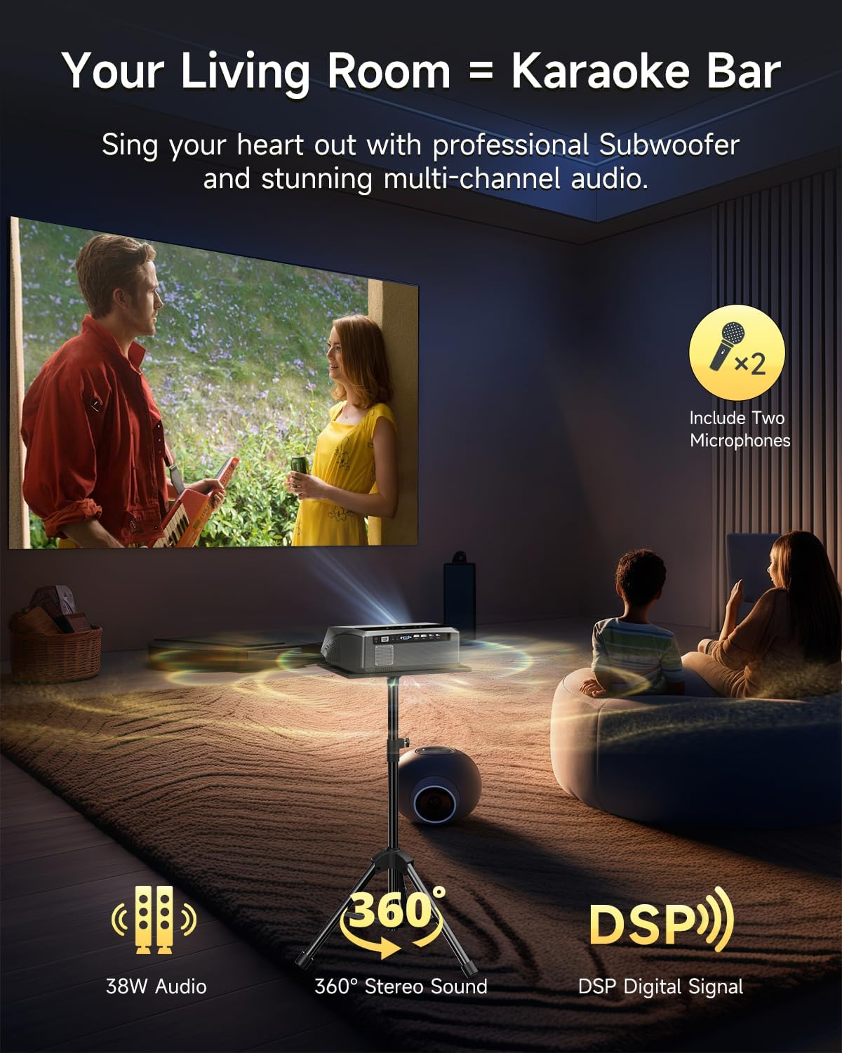 【Singing at Home】The video projector has a built-in professional subwoofer as well as DSP chip brings multi-channel digital sound, outputting stunning premium sound effects. Equipped with home karaoke software with two wireless microphones. You can realize KTV freedom at home and sing whenever you want.