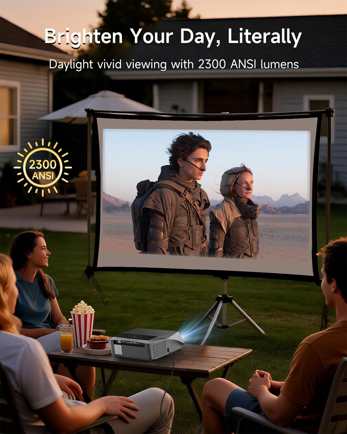 【High Brightness Projector – Fearless of Day & Night】Equipped with new TS-LED brightening tech, the 4k projector reach 2300ANSI lumens. As used a high transmittance DSLR lens, it owns low reflective for eye-protecting, also deliver bright image that lights up your life and straight to the heart. Feel free to use it at home during the day or at night! 【Not recommended for daylight outdoors.】