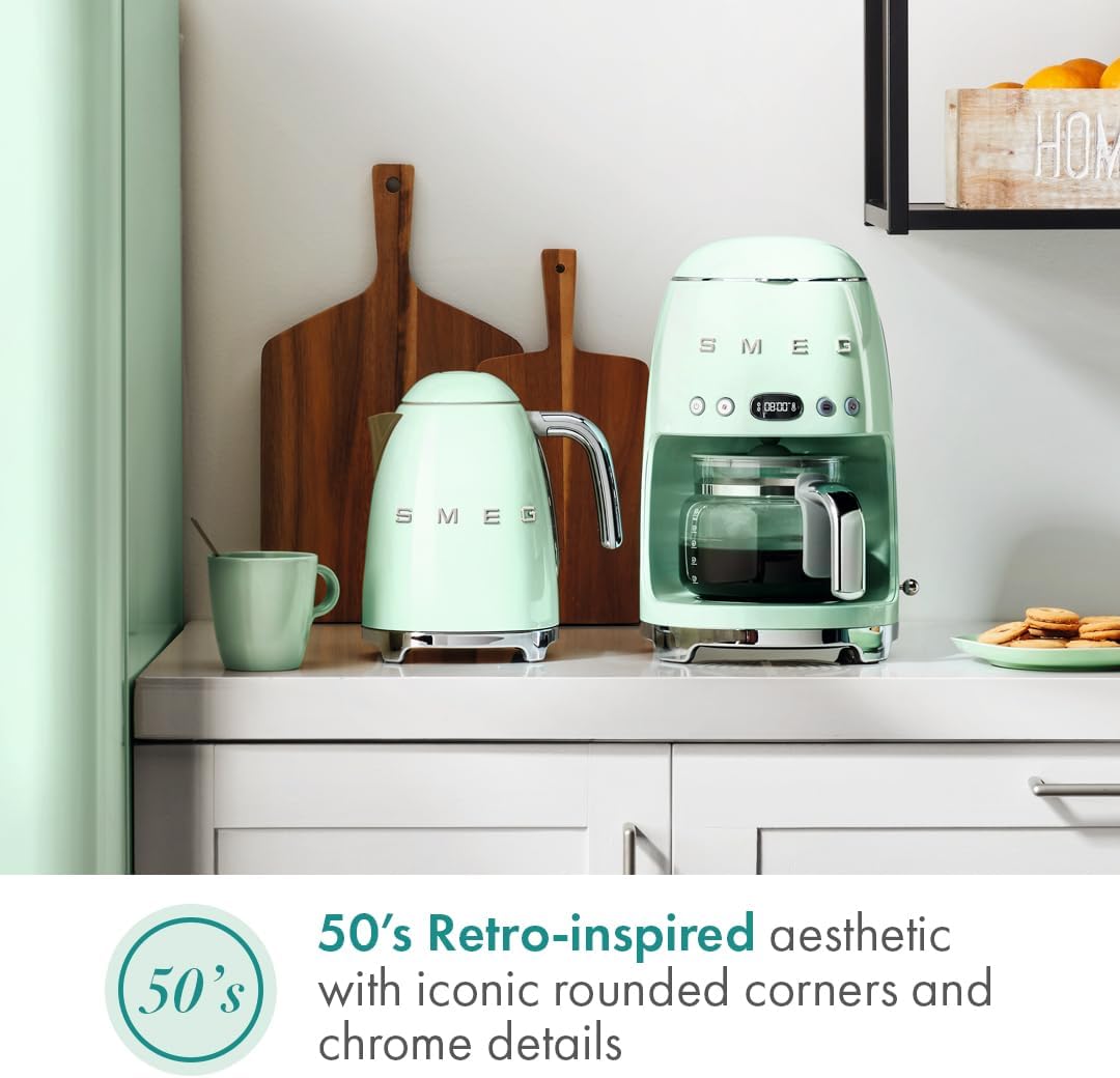 Start your mornings in style with the SMEG 10-Cup Retro Drip Coffee Maker, a perfect blend of timeless 1950s-inspired design and modern brewing technology. Crafted for coffee lovers, this machine delivers rich, flavorful coffee with customizable brew settings to suit your taste. Featuring a programmable auto-start function, you can wake up to the aroma of freshly brewed coffee every morning. Adjust the aroma intensity for a bold or mild cup, while the keep warm function ensures your coffee stays at the perfect temperature for up to 60 minutes. The intuitive LED display and push-button controls make operation effortless, while the 10-cup glass carafe provides enough coffee to fuel your day.