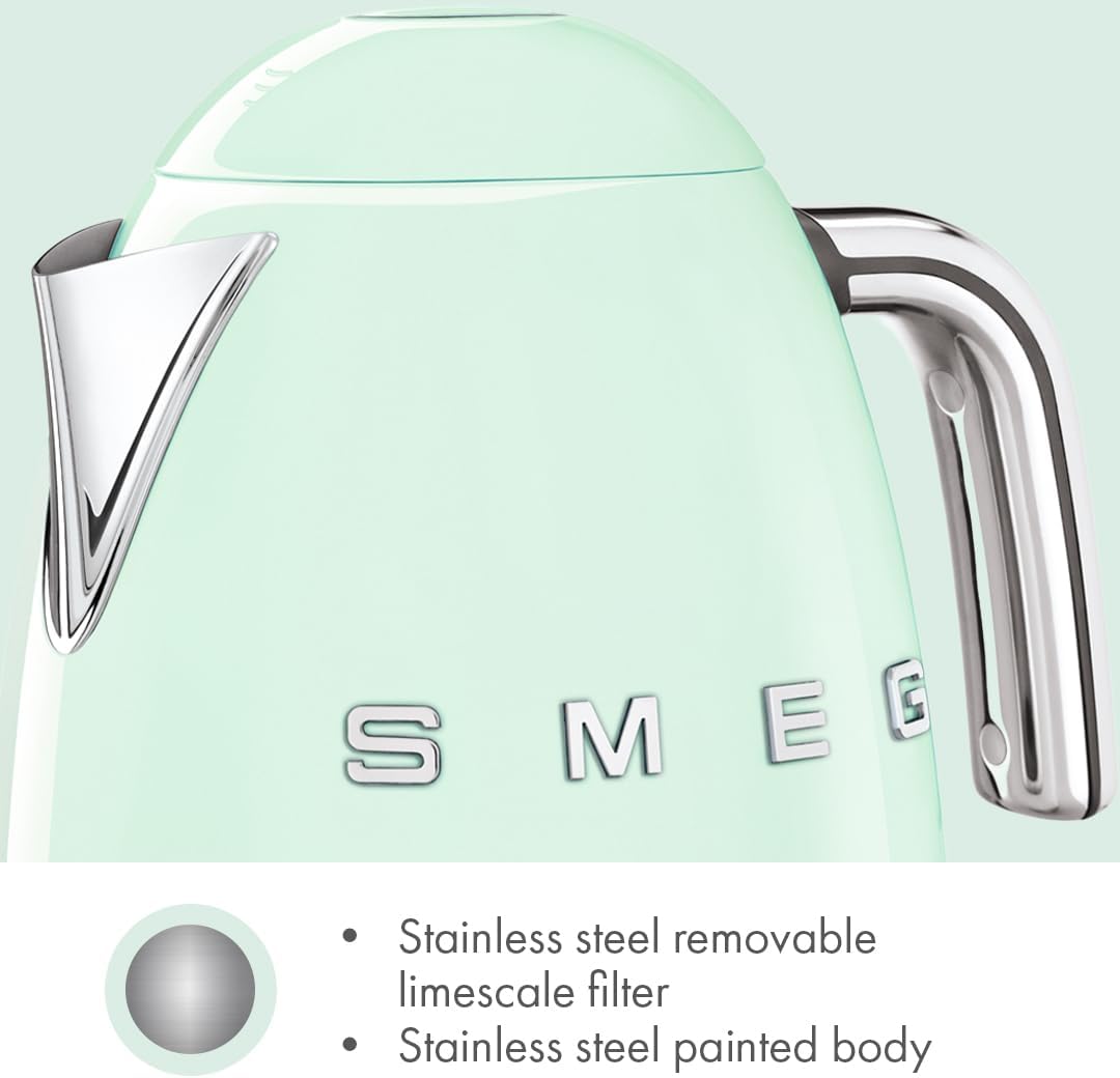 Elevate your kitchen with the SMEG 7-Cup Variable Temperature Electric Kettle, where iconic retro style meets cutting-edge technology. Crafted with stainless steel and designed to enhance your countertop, this stylish kettle offers precision heating with adjustable temperatures ranging from 122°F to 212°F. Whether you’re brewing delicate green tea or preparing a robust coffee, the intuitive control panel and LED display make it easy to achieve the perfect temperature every time. With a powerful 1400W concealed heating element, a hidden cable cord compartment wrap under the base, and a 360° swivel base, convenience and performance come together in one sleek package. Designed with thoughtful details, the SMEG Variable Temperature Kettle features a soft open lid for controlled steam release, an anti-drip spout to keep your countertop spotless, and a removable scale filter to maintain clean and pure water. More than just a functional appliance, this kettle is an eye-catching centerpiece that seamlessly blends modern innovation with classic charm. Its durable stainless steel body, automatic shut-off, and keep-warm function ensure safety and reliability. Add a touch of sophistication to your space and enjoy your favorite hot beverages in style.