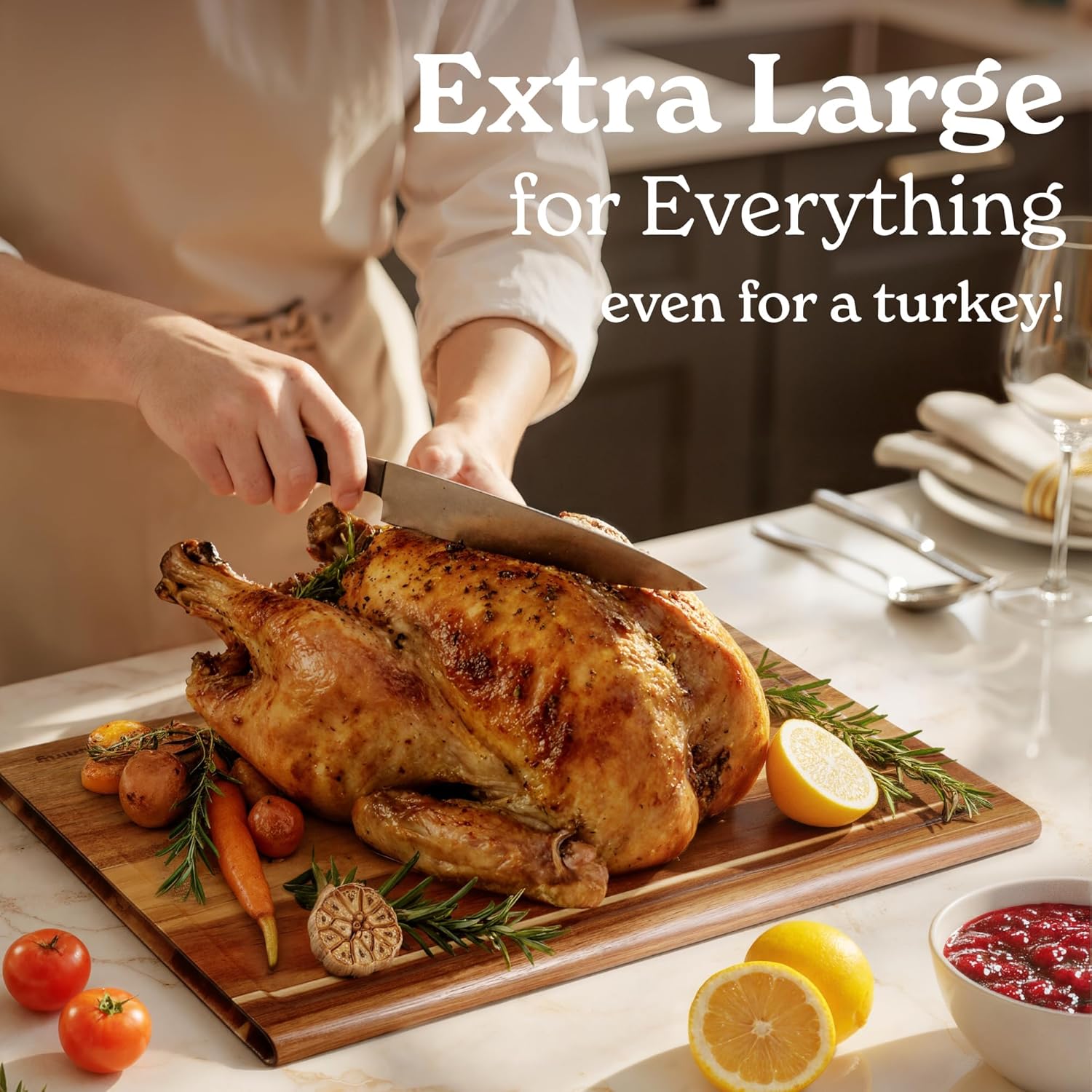 【Extra Large, Designed for Perfect Cutting】Cut it, prepare it, serve it! Extra large Cutting Board for kitchen measures 17 x 12 x 1.2 inches, used for everything from cutting and chopping to carving and serving. Perfect for BBQ masters and all cooking enthusiasts. Thoughtfully designed with recessed grips for easy handling, each board is reversible, Use the grooved side to collect juices and crumbs as you cut, or flip the board over to serve cheese, charcuterie or appetizers, perfect complement to any kitchen