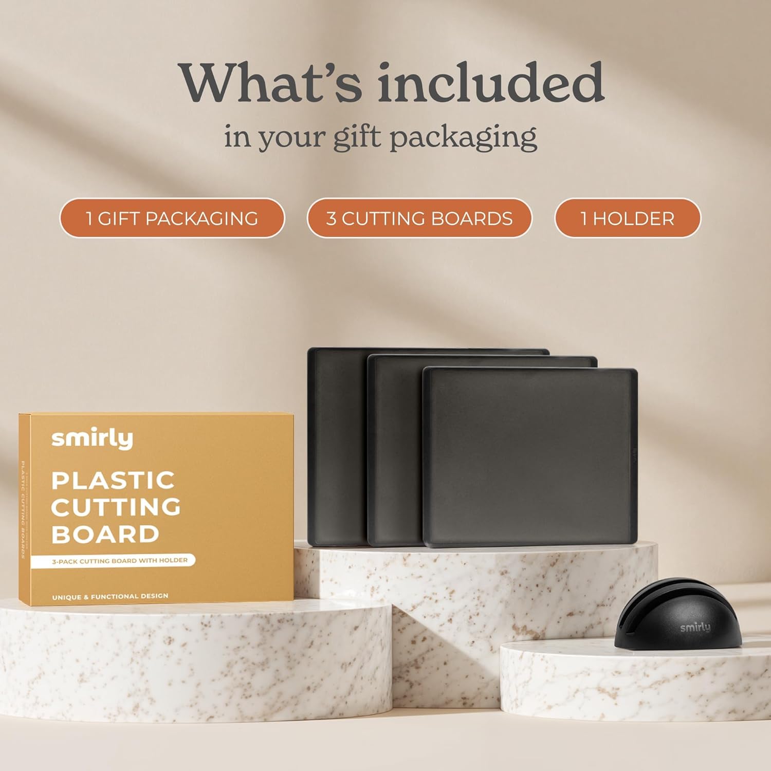 3-Pack with Holder: This cutting board set includes small, medium, and large cutting board sizes for every prep need. It also comes with a compact holder that neatly organizes all boards vertically, keeping your countertops clutter-free while ready for any chopping task