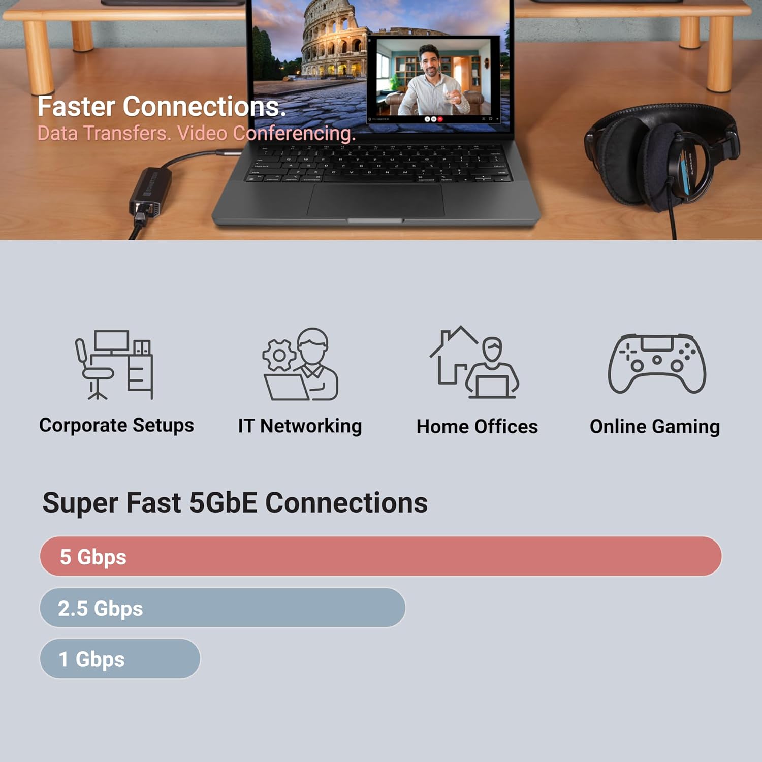 Adds a 5 Gigabit Ethernet (RJ45) port to your computer.Supports NBASE-T Standard: 5 Gb/s speed supported when used with a multi-Gigabit compatible 10GbE switch or router. Also supports 2.5 Gbps, 1 Gbps and 100 Mbps speeds.Budget Friendly: Low-cost adapter connects your computer to infrastructure via inexpensive Cat 5e (or better) cables at distances up to 100 meters.Connects to any USB‑C or Thunderbolt computer port, or to a USB-C port on a dock.Bus-powered: Powered through its USB connection, the Solo5G requires no power adapter.