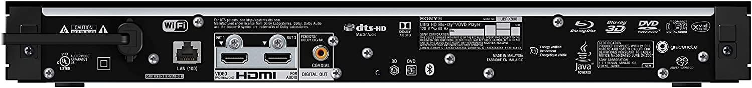 Region Free DVD and Blu Ray watch any DVD BD or UHD on any TV with the Built-in NTSC⇔PAL 4k HD Converter. View your Blu-ray discs in 4K resolution on your compatible 4K TV njoy 4K multimedia playback and near-4K upscaling of older sources on your compatible display with the Sony UBP-X800 4K Wi-Fi Blu-ray Disc Player. It supports high-resolution audio formats such as Dolby TrueHD plus the object-based audio formats Dolby Atmos and DTS:X. The UBP-X800 features two HDMI outputs and a digital coaxial output for versatile connectivity options. This Blu-ray player has Wi-Fi and an Ethernet port built-in to allow you to stream multimedia content from your home network. The front USB port also provides for the playback of your digitally stored media. You can connect a pair of Bluetooth headphones for private listening, or Bluetooth speakers to move your audio out of the main listening area.