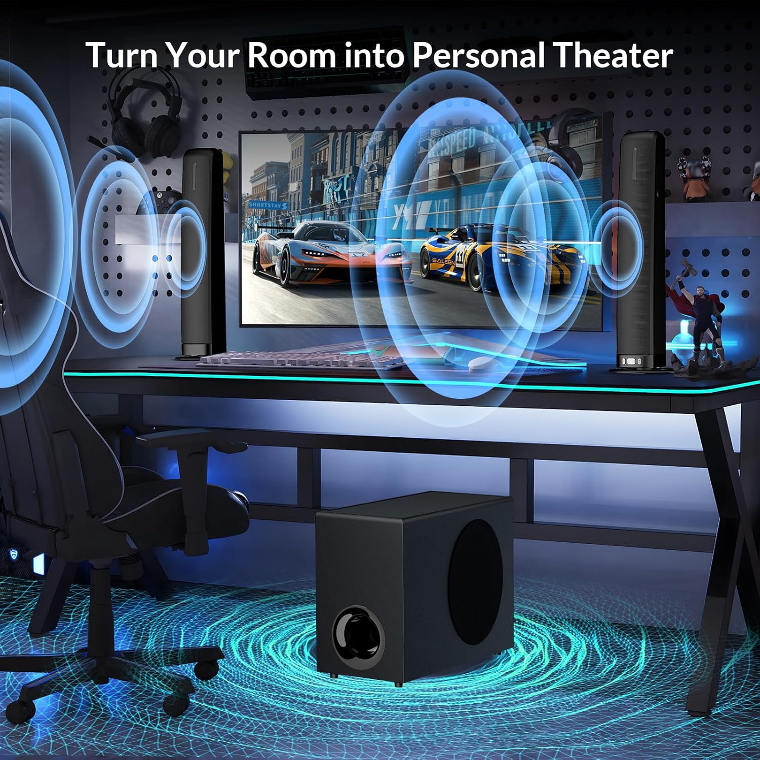 ใ€๐ˆ๐ฆ๐ฆ๐ž๐ซ๐ฌ๐ข๐ฏ๐ž ๐ƒ๐ž๐ž๐ฉ ๐๐š๐ฌ๐ฌใ€‘: With 4 high-performance drivers, this soundbar delivers richer detail and intensity. Whether you’re listening to a soft whisper or a dramatic bass drop, feel the full power of your audio. The adjustable subwoofer adds layers of depth, giving your movies fuller soundstage, your music vibrancy, and your games a pulse-quickening experience. Get lost in the bass and sounds.