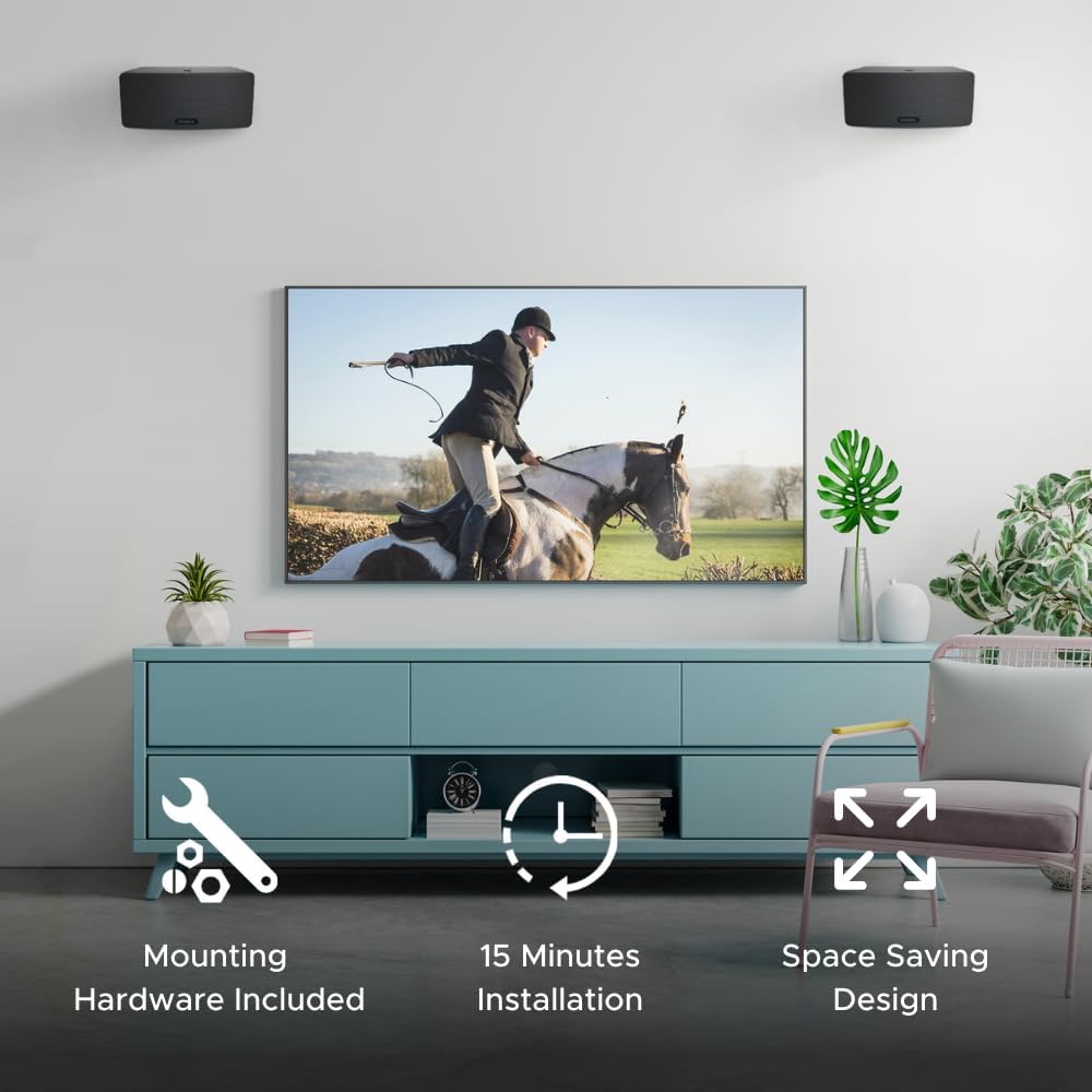 INGENIOUS DESIGN – This design is simple yet cleverly thought out. The mounts are slim and almost impossible to see once the speaker is mounted to the wall. The speaker can be mounted horizontal or vertical with a wall clearance of 75mm. Please see the images to understand the mounting options.