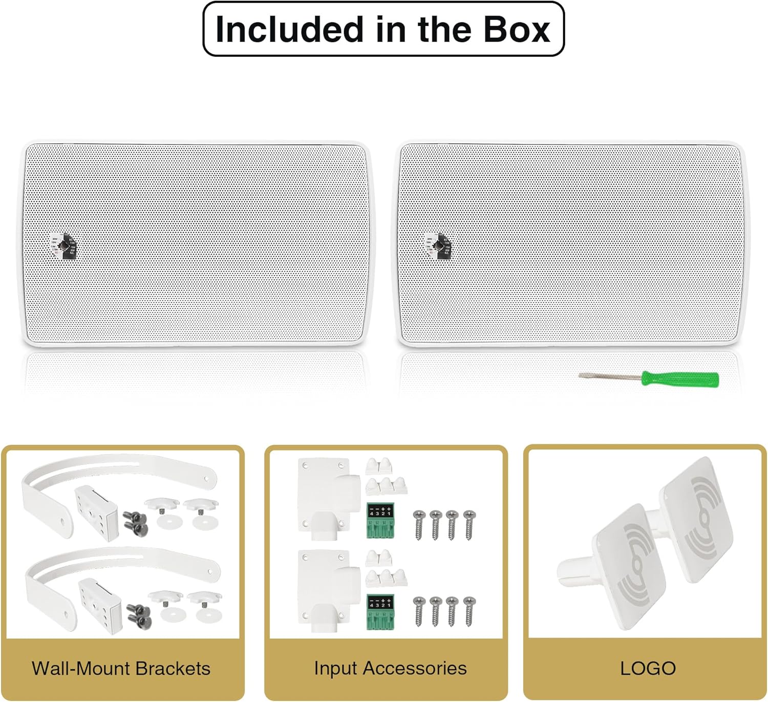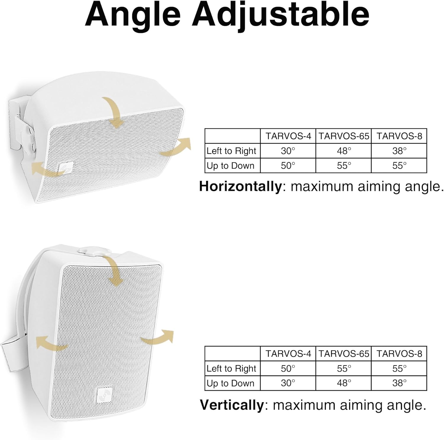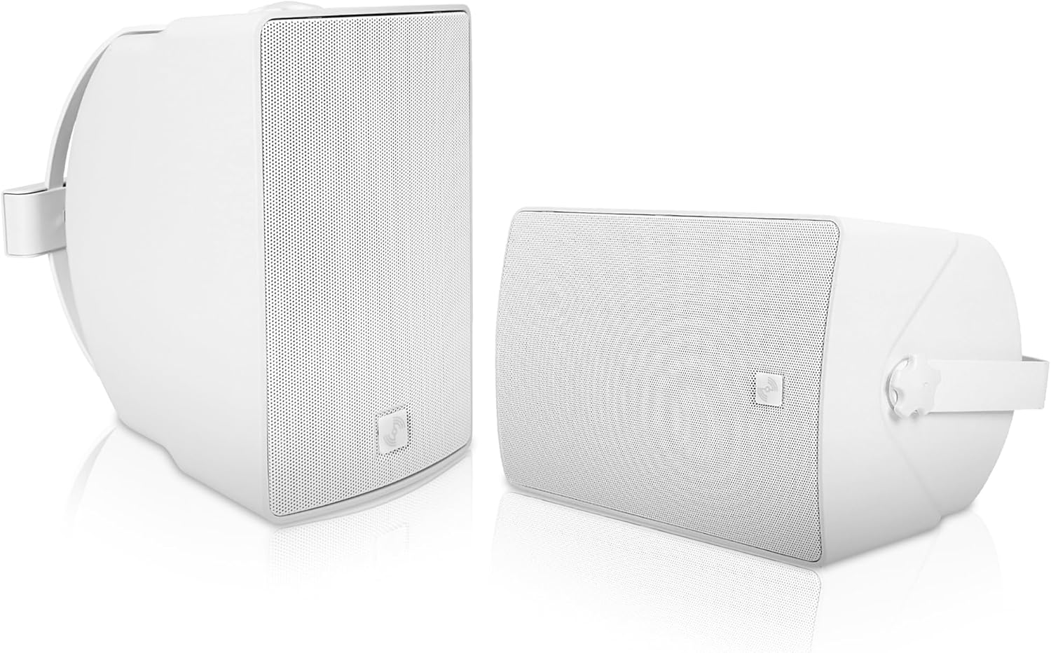 TARVOS-65W-PAIR COAXIAL SPEAKERS: Includes (3) TARVOS-65W-PAIR (6 speakers in total) white coaxial surface-mount speakers (IP 56 Rated), each featuring a 6.5“ woofer and a 1” coaxial compression driver delivering 60W RMS and 120W program power (8Ω) and includes yoke wall-mount brackets, offering 180° rotation and adjustable angles