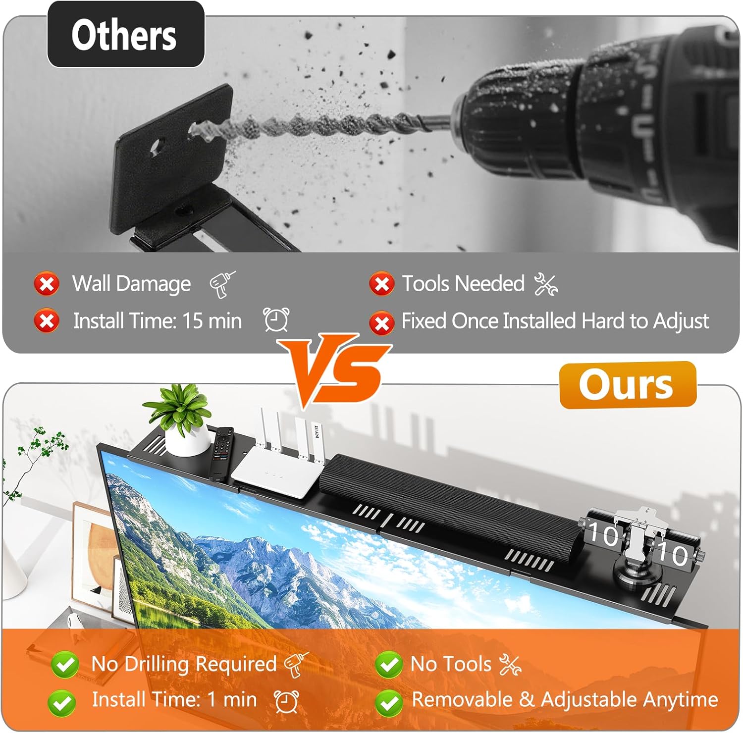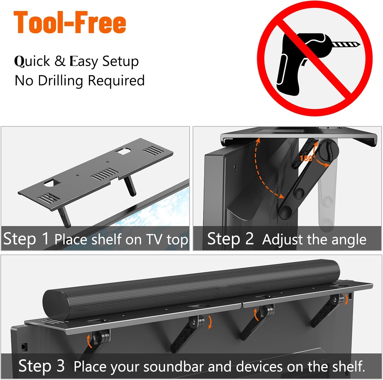 No Drilling Required: Say goodbye to complicated installations and wall damage. This soundbar mount simply sits on top of your TV—no tools, no screws, no drilling required. It’s the perfect solution for renters or anyone who wants a quick and clean setup.Simply unpack it, place it on top of your TV, adjust the angle of the support feet, and start enjoying your movie in less than 30 seconds!