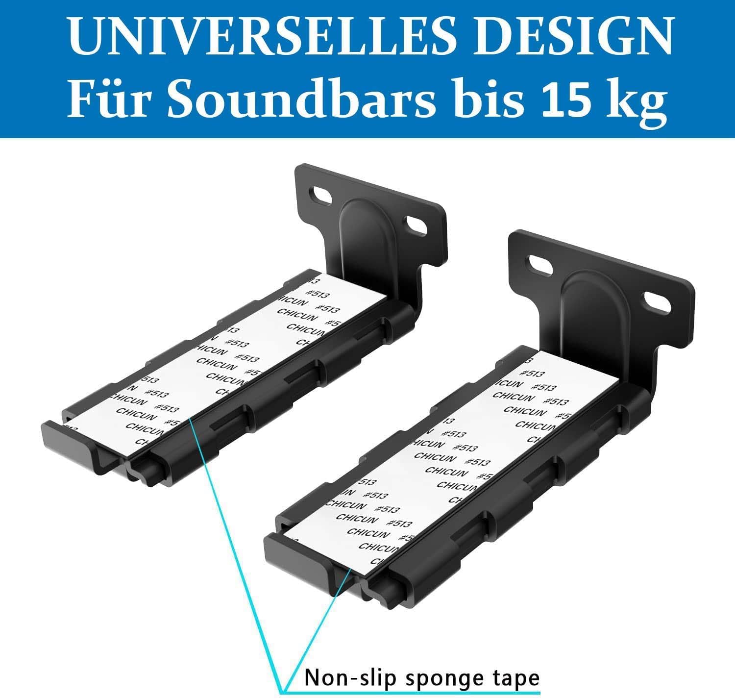 Hold Firmly & Heavy Duty – The mounting soundbar under TV with extra 2 pairs of adhesive stickies that can hold your soundbar firmly. The adhesive stickies with anti-slip strips can be assured that your soundbar will not fall off