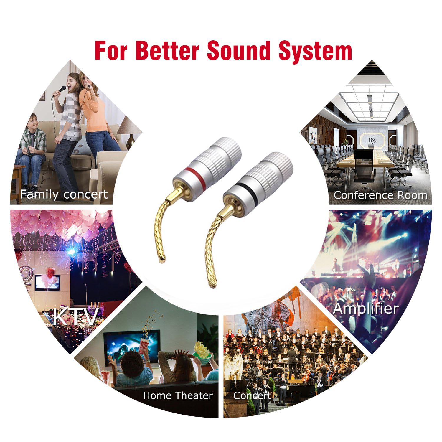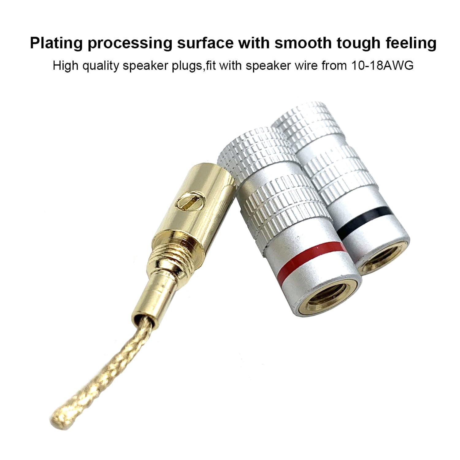 Compatible with 12 to 18 AWG speaker wires. Fit bare wires, Used for A/V receivers, home theater, amplifiers, surround sound systems, banana wall plates, works with multiple sizes of speaker wire.