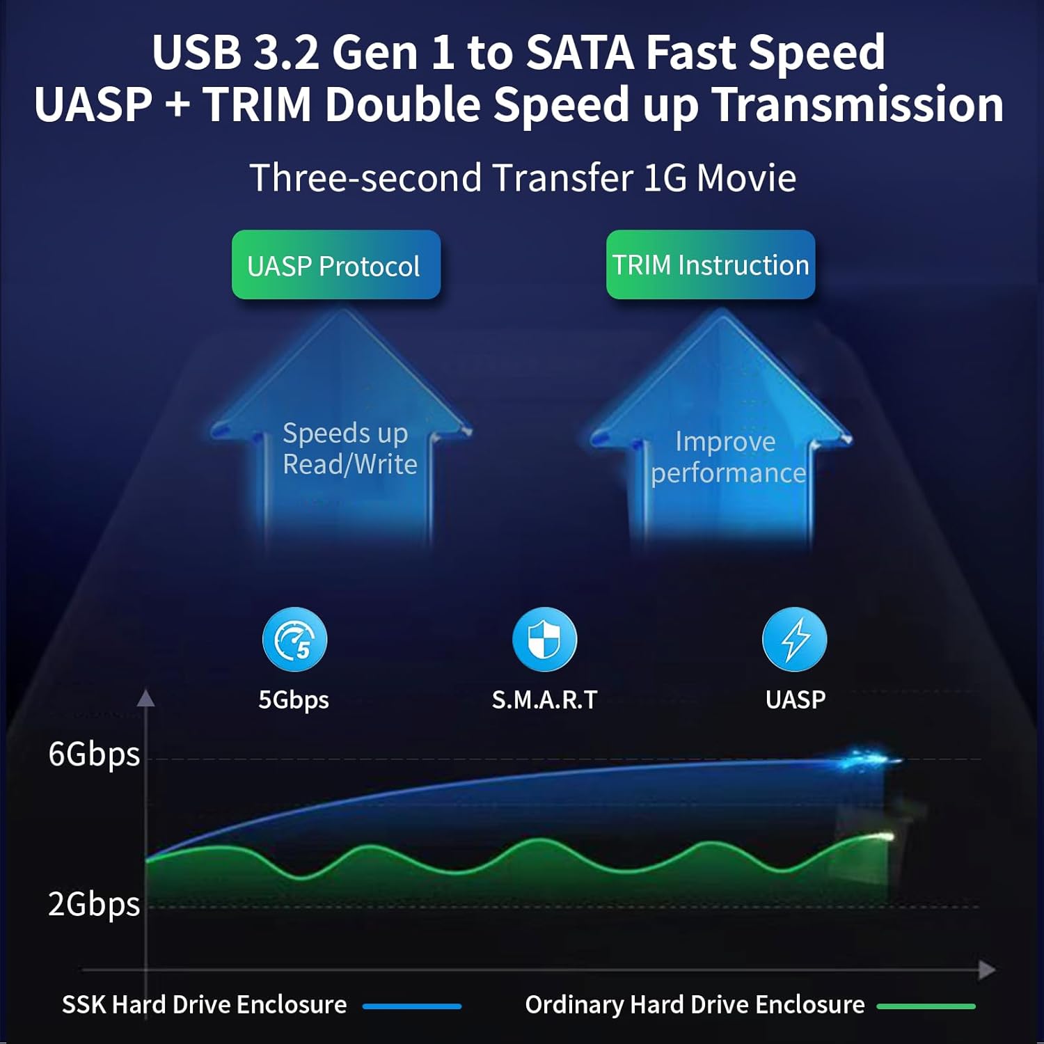 USB 3.2 UASP & 5Gbps High Transfer Speeds: SSK 3.5 hard drive enclosure supports UASP accelerated transmission protocol, 20% faster than traditional USB 3.0 speed. High-speed transfer SSD/HDD dock supports USB3.2 GEN1/USB3.0 with SSD read/write speed up to 450MB/S
