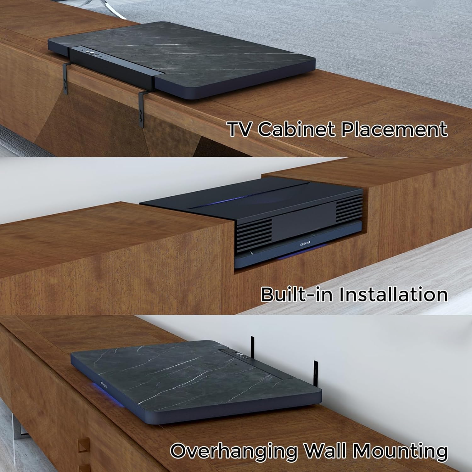 【Flexible Installation Options】 SCREENPRO motorized slider tray adapts to any space: wall-mount, built-in, or TV cabinet setups. Streamlined design integrates seamlessly into modern home theaters.