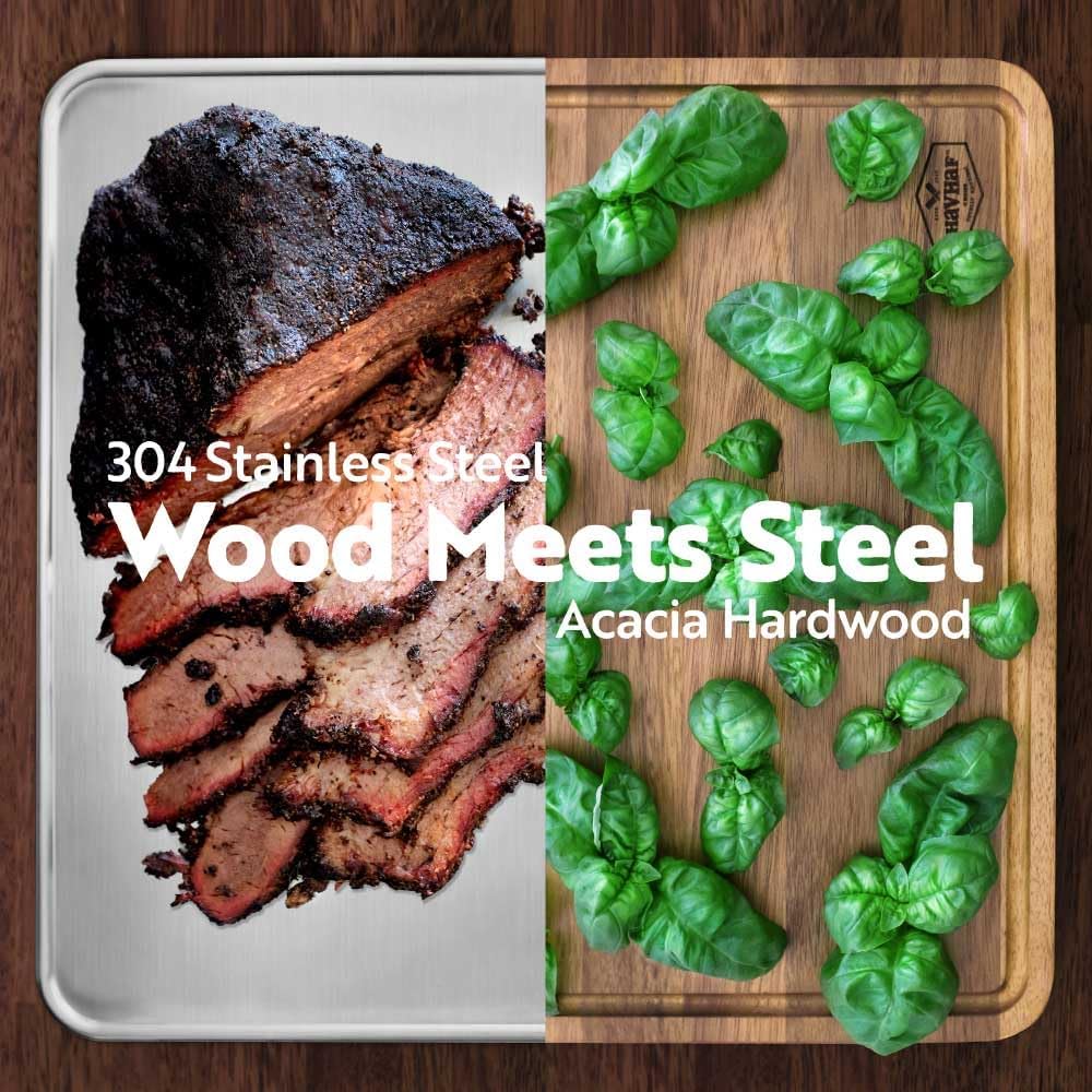 [WOOD MEETS STEEL – YOUR ALL-IN-ONE PREP AND SERVE SOLUTION!] A Board That Knows How to Work Both Sides! From heavy-duty chops to delicate slices (or even serving the in-laws), this board’s got you covered. Your Perfect Kitchen Sidekick!