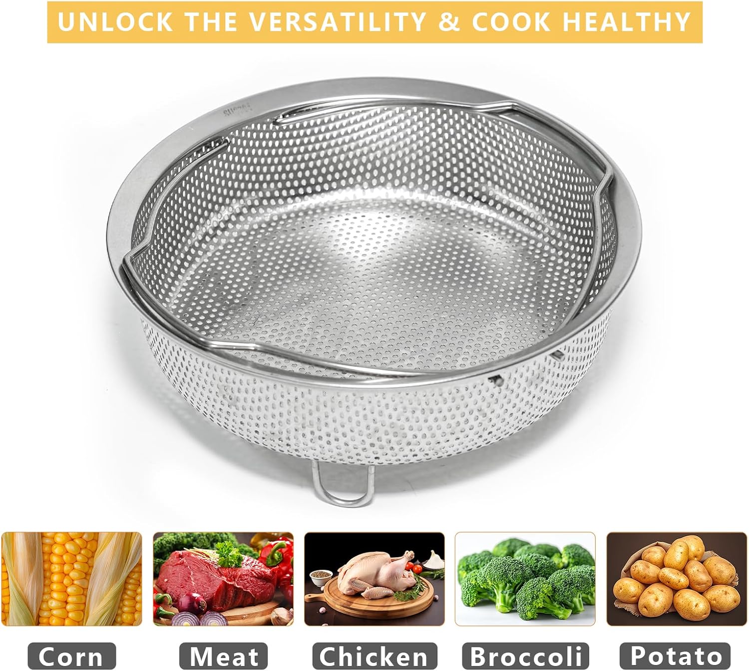 Our premium steamer basket fits perfectly a variety of steamer pots, ideal for cooking a variety of foods, including eggs, meats, and veggies.