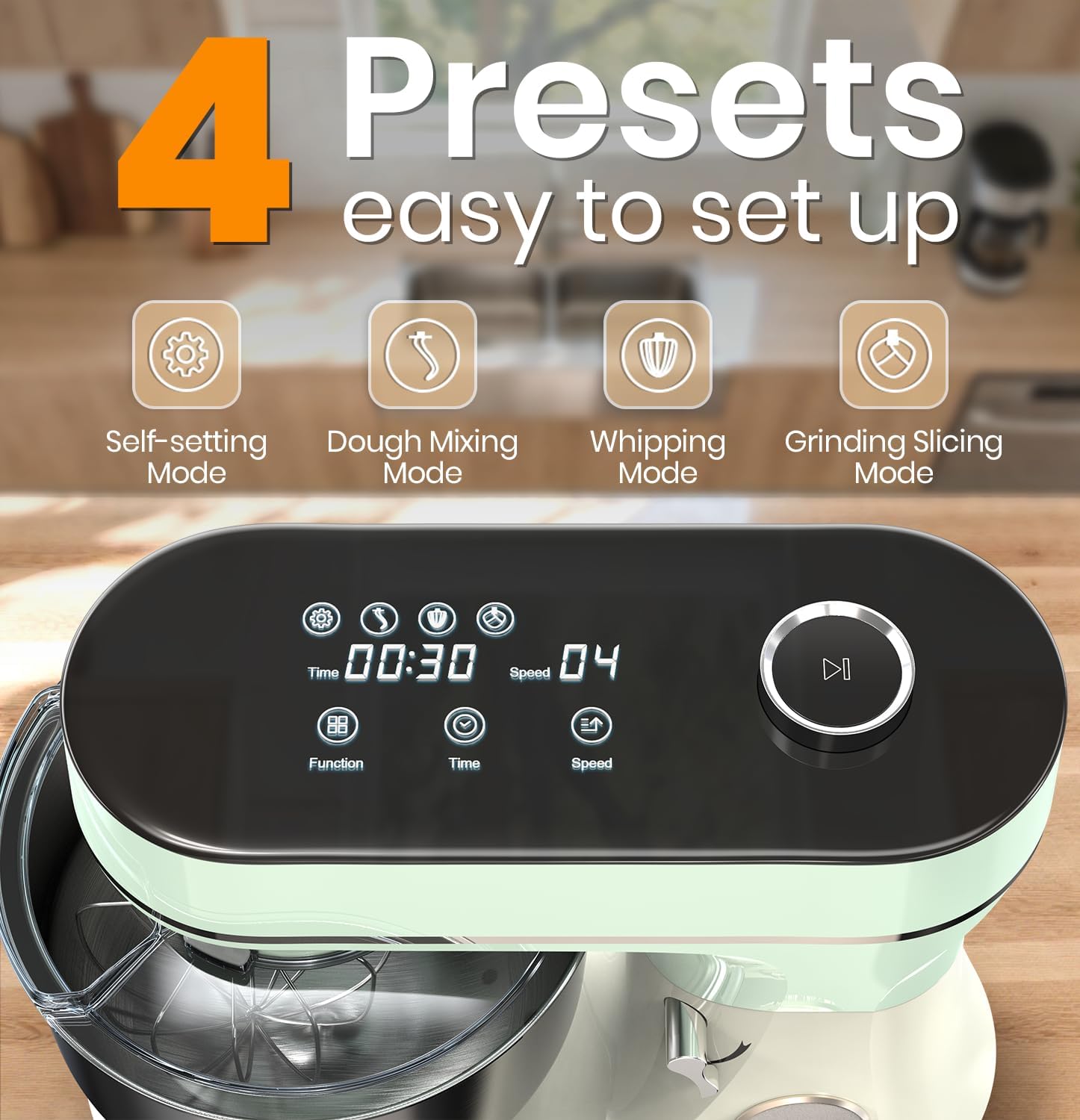 Stand Mixer 6QT Kitchen Mixer with LED Smart Touchscreen, 11-Speed Tilt-Head Mixer with Timer, 4 Preset Menus, Stainless Steel Bowl, Dough Hook, Whisk, Beater,Green
