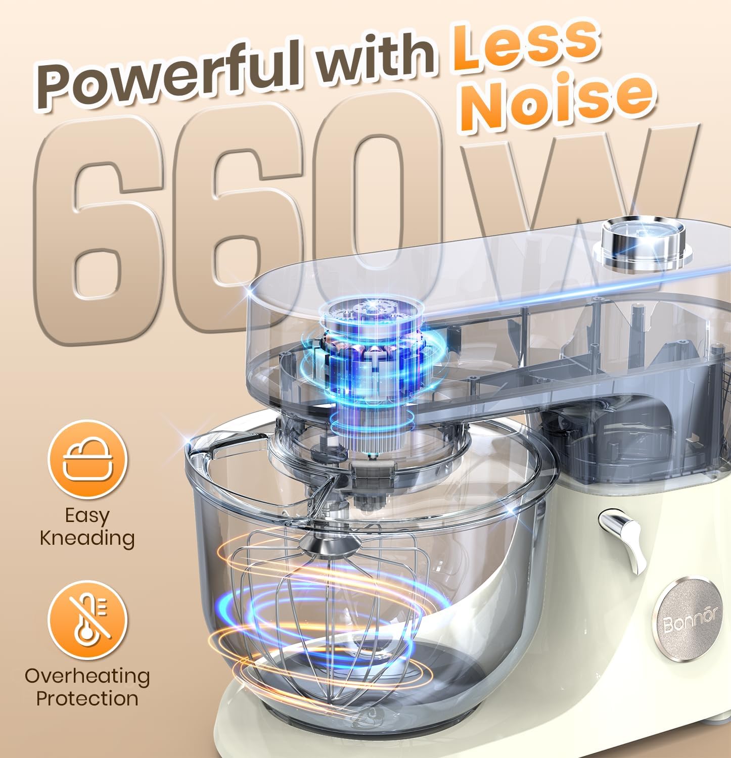 【More Power, Less Noise】 The Bonnor kitchen aid standing mixer is built with a 660W pure copper motor, giving you 50% more power to tackle heavy dough, thick cream, and tough ingredients with ease. Picture kneading bread or whipping frosting—this mixer powers through effortlessly while 360° planetary mixing ensures every bit is blended smooth and even. Overheat protection allows up to 30 minutes of nonstop mixing, and the triple noise-reduction design with suction cups cuts noise by 20% for a quiet, professional baking experience.
