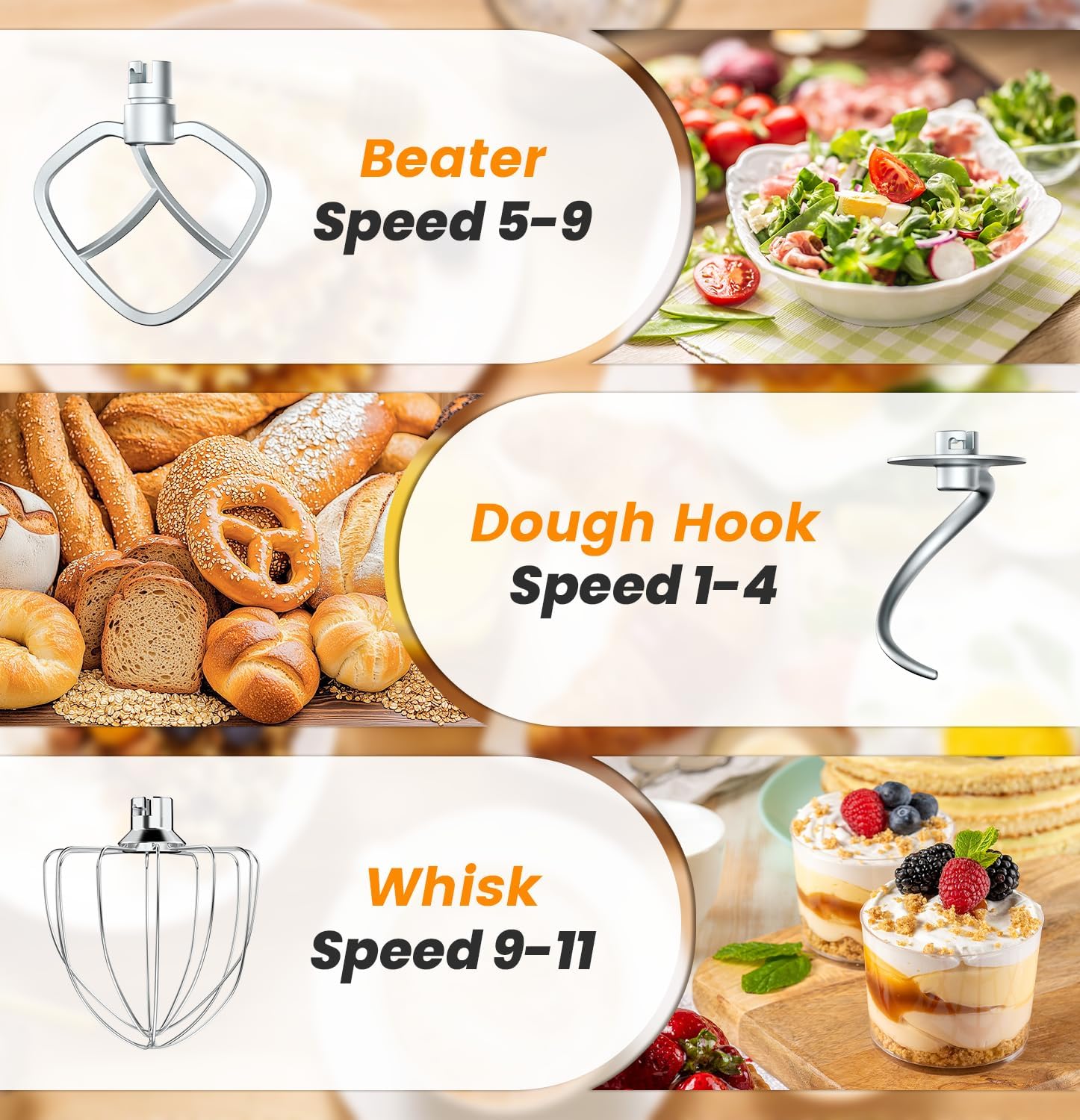 【11 Speed Setting】 This dough mixer features 11 precise speeds to cover every task—low for gentle kneading, medium for smooth mixing, and high for fast whipping. The pulse function gives instant bursts of power, helping you break lumps, scrape bowls clean, and fine-tune textures in seconds. From airy meringues to heavy bread dough, this electric stand mixer adapts effortlessly, delivering consistent results and professional-level baking control in your own kitchen.