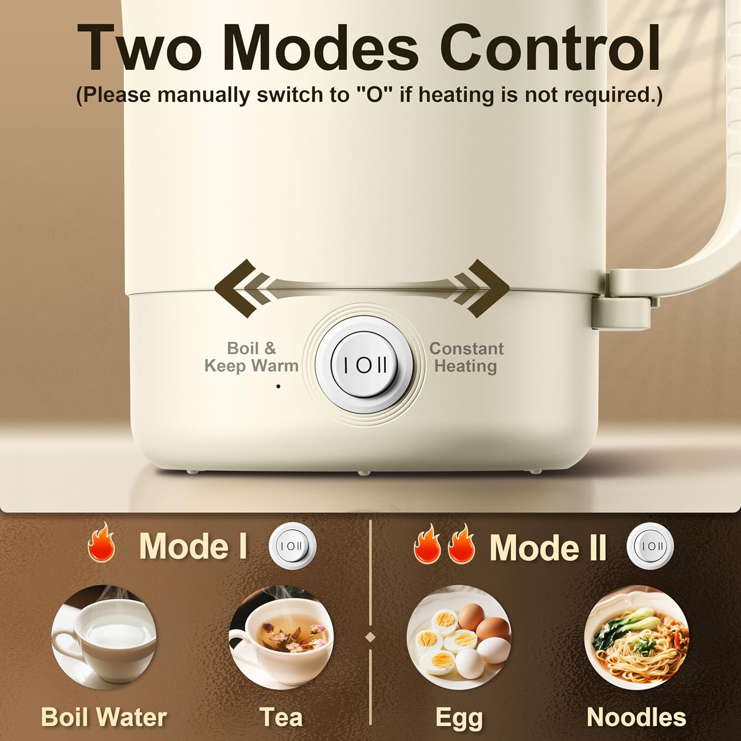 【Dual Function Modes】 With its BOIL & KEEP WARM and CONSTANT HEATING modes, this portable kettle allows water to fast boil with a simple button press in BOIL & KEEP WARM mode, automatically reheating once the temperature drops below 185°F. Its CONSTANT HEATING mode is an ideal choice for cooking noodles, eggs, or oatmeal, enabling it to meet a variety of needs. (Note: Please manually turn off the power if heating is not required.)