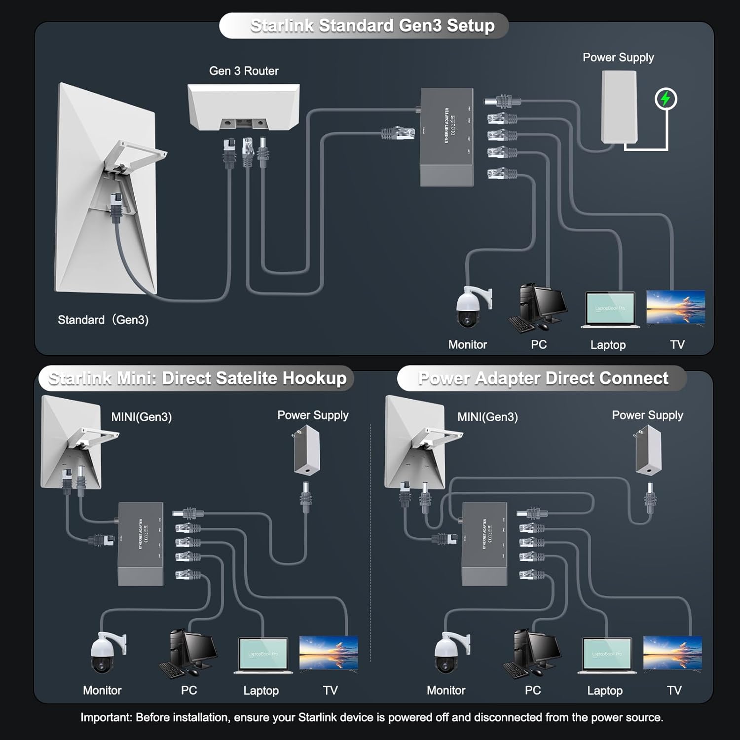 【Universal Compatibility】 Connect virtually any RJ45-equipped device—routers, laptops, desktops, smart TVs, printers, and more—to your Starlink Ethernet Adapter. All ports support standard RJ45 cables (*For optimal performance, use Cat5e/6/7/8 cables*). Fully compatible with both Gen 3 and Mini systems.