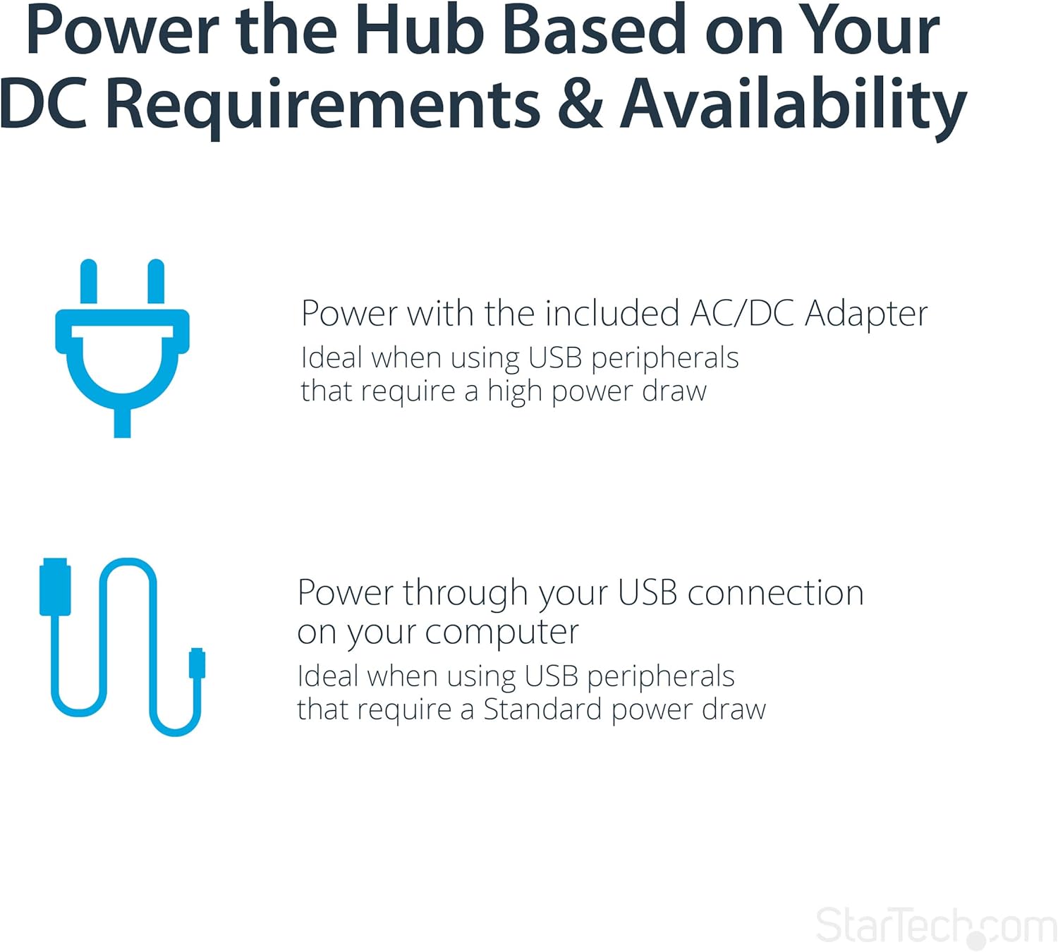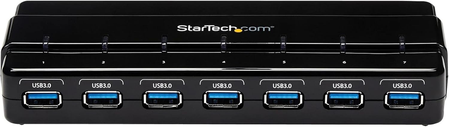This USB 3.0 hub lets you add seven external USB 3.0 ports to a computer from a single USB 3.0 host connection. Enjoy High Speeds Offering data transfer rates up to 5 Gbps, the USB 3 hub meets SuperSpeed USB 3.0 specifications and is backward compatible with USB 2.0 and 1.x devices. Ultimate Convenience Designed for easy port access when connecting or disconnecting devices, the multi port USB hub features one-sided port orientation, with current overload detection and protection across all seven ports. This USB 3.0 splitter hub is great for expanding your system USB 3.0 capabilities with additional ports, making USB ports more accessible, separating tightly packed ports and extending the range of USB devices, having the hub act like a mid-point repeater. Hassle-Free Use This USB port extender hub supports plug-and-play and hot-swap technologies, letting you switch and operate your connected devices without having to power down the host computer. This USB 3.0 hub is bus powered for use in environments where a power outlet may be unavailable, but is perfect for high-power USB devices when used with the included optional power adapter. This multi port USB 3.0 hub and port expander is backed by a StarTech..