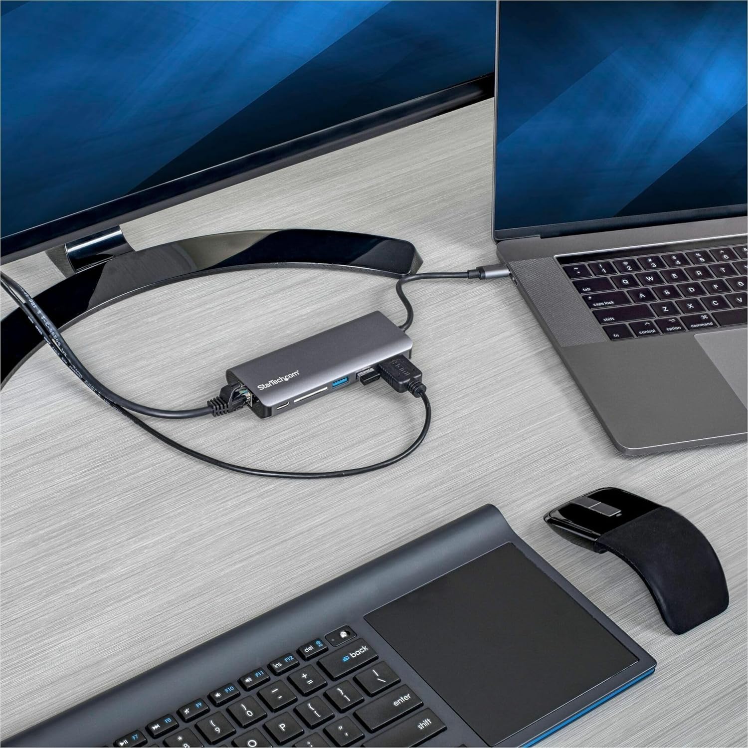 This portable USB C docking station with HDMI turns your MacBook Pro, Dell XPS, or other USB Type C or Thunderbolt 3 laptop into a complete workstation, anywhere you go. USBC HUB AND DOCKING STATION IN ONE When coupled with your laptop display, this USB C laptop dock makes it easy to create an Ultra HD, dual-monitor workstation, enabling you to connect a 4K HDMI monitor. The Gigabit Ethernet port ensures reliable wired network access, which is ideal for areas with limited Wi-Fi access. Plus, with two additional USB 3.0 ports (Type A) you can connect your existing peripheral devices, like your mouse, keyboard or flash drive. The USB C adapter also features an SD card reader slot so you can access all of your multimedia content. Plus, it offers advanced charging through USB Power Delivery 3.0. CONNECT & CHARGE YOUR USB PERIPHERALS This USB C multiport dock gives you one USB Type C port and two USB-A ports to connect your USB devices, including your keyboard or mouse. With support for USB Power Delivery (PD) 3.0 60W, the USB C adapter dock lets you power and charge your laptop, and power your peripherals. PD 3.0 features Fast Role Swap to prevent USB data disruption when switching power sources. PERFECT PORTABILITY Ideal for mobile use, the portable docking station features a USB Type C port that supports pass through charging. It is compact and lightweight, and consolidates multiple ports into a single dock, which means you don’t need to bring along multiple single-function adapters. It’s the perfect, all-in-one solution for the IT or business professional. This USB C multiport dock is backed by a StarTech..