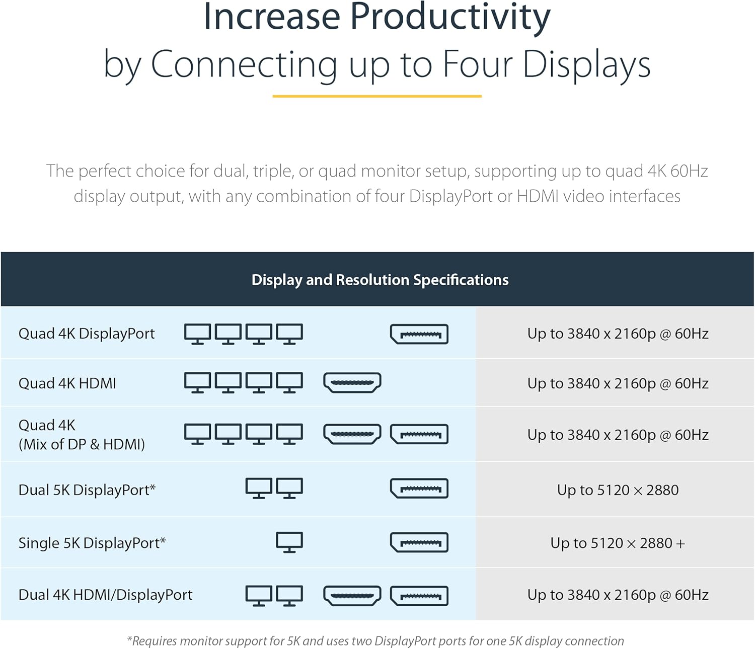 COMPATIBILITY: Supports Windows, macOS, ChromeOS, Linux and hardware platforms including Intel, AMD and the Apple M-Series, enabling four external displays even on laptops that natively only support one; Driver installation required on Windows and macOS