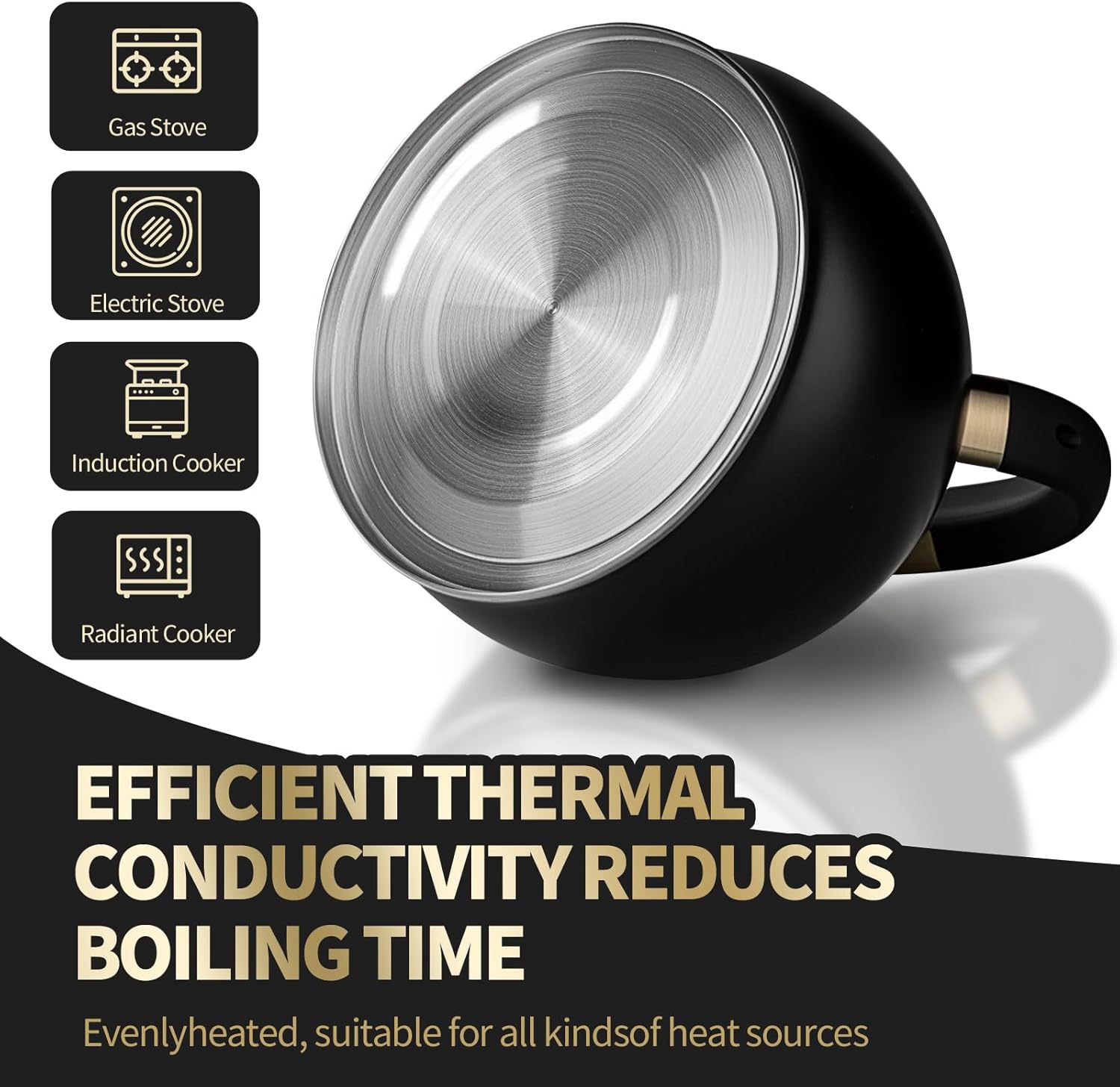 Fast Boiling Innovation: The stovetop kettle is designed with a specialized stainless steel-clad bottom that improves heat distribution, reduces heat loss, and speeds up boiling time. Compatible with all stovetops including induction, gas, electric, halogen, and radiant.