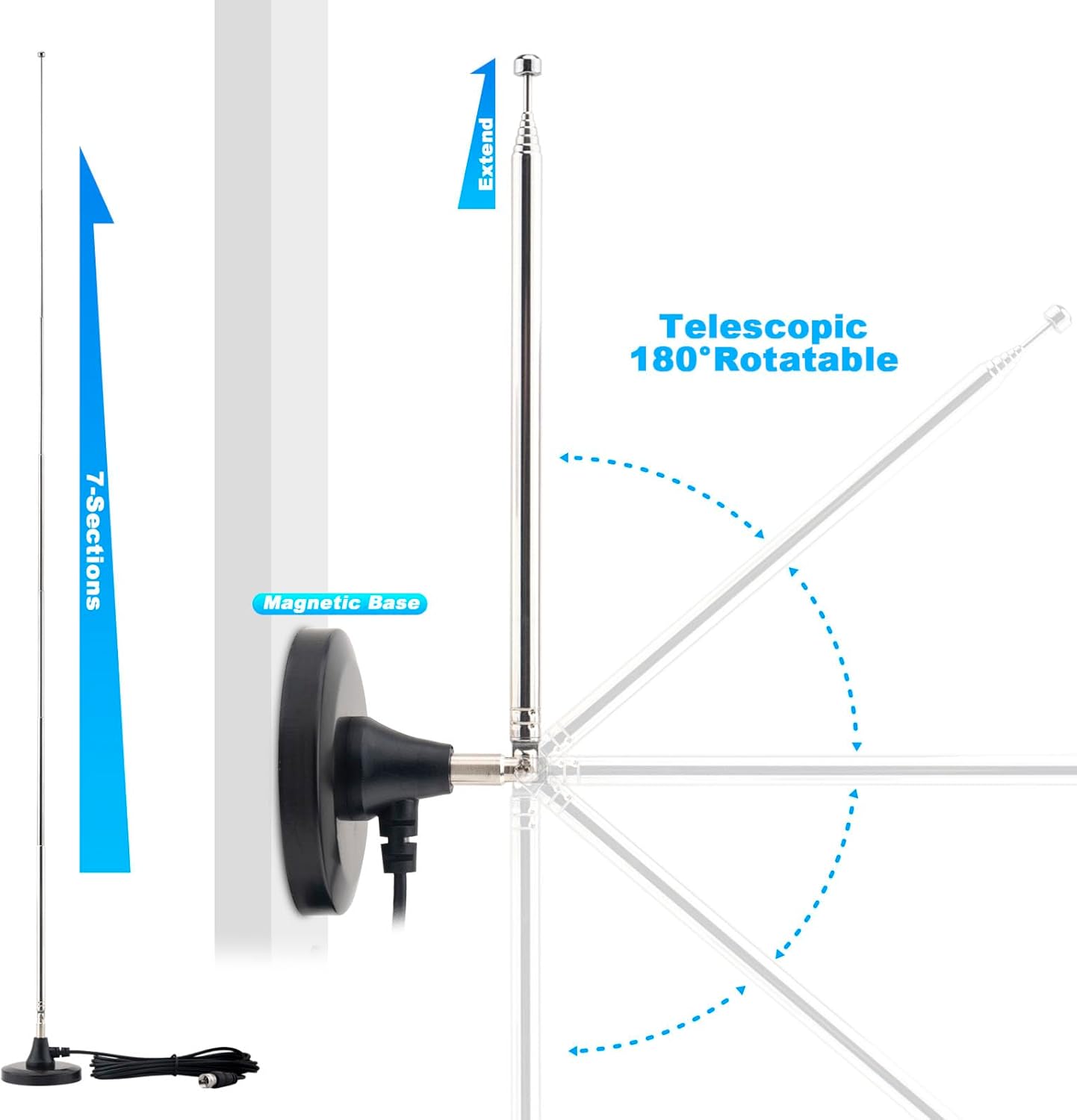 Simple Installation Design: FM digital telescopic antenna, equipped with a magnetic base and a 3-meter extension cable, easy to achieve worry-free installation and optimal positioning.