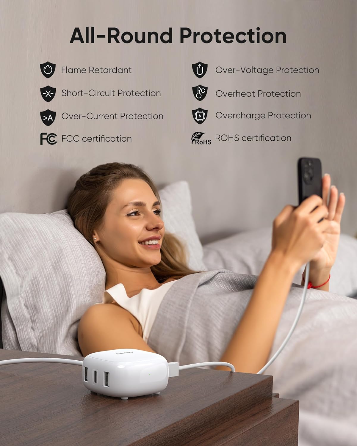 【Use Anywhere】The compact USB charger block comes with a 4ft long extension cord so that you don’t have to stay near the wall outlet. Just bring it with you and plug this multiple USB wall charger into the nearby 120V outlet and enjoy the charge. Bye, low-battery anxiety!