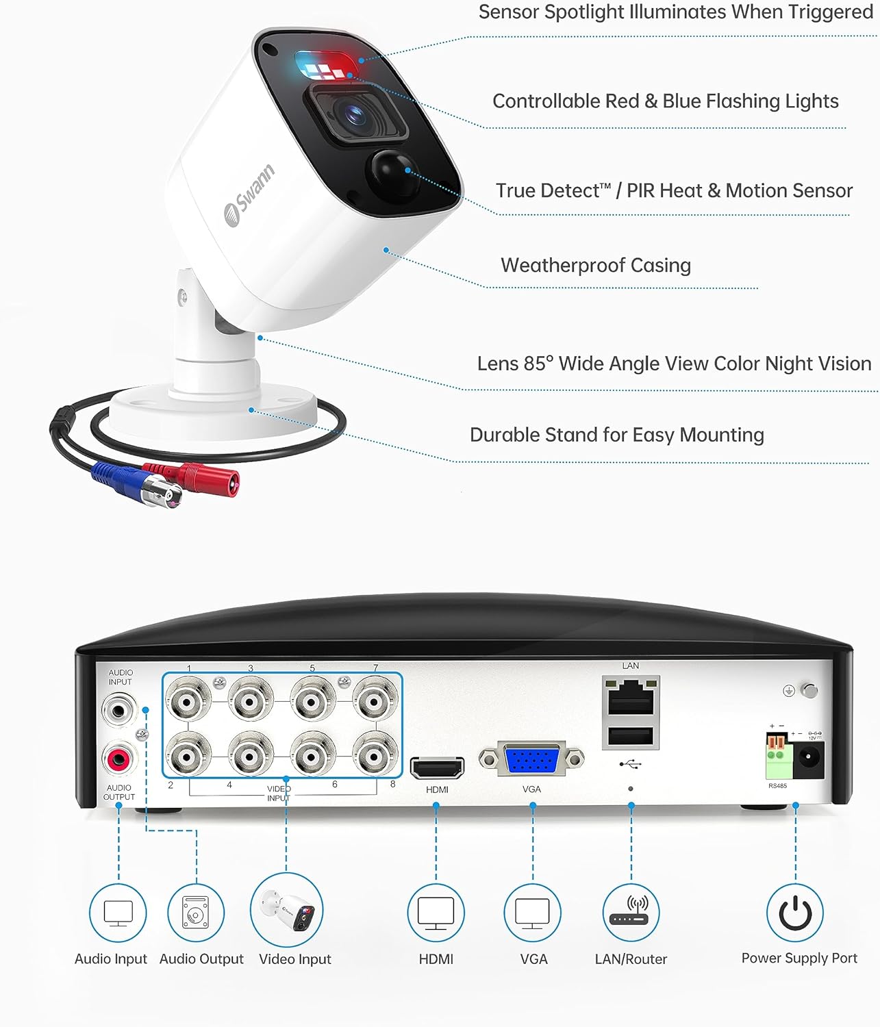 Comprehensive Coverage with 8 Bullet Cameras: This Swann system includes eight indoor/outdoor wired bullet cameras, all designed to withstand extreme weather conditions, thanks to their IP66 rating. Get maximum coverage of your premises, both indoors and outdoors.