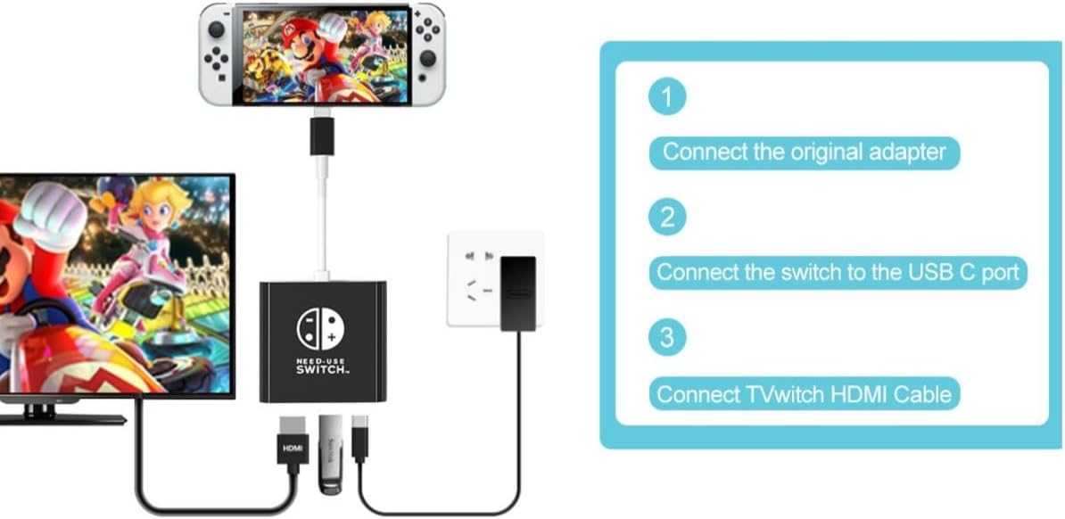 1.Power by 15V 2.6A adapter and plug tv hdmi cable into dock. 2.Change TV signal to correct HDMI port. 3.Wake up switch and plug adapter usb-c output to switch console. 4.Wait 3-8 seconds tv will light auto.
