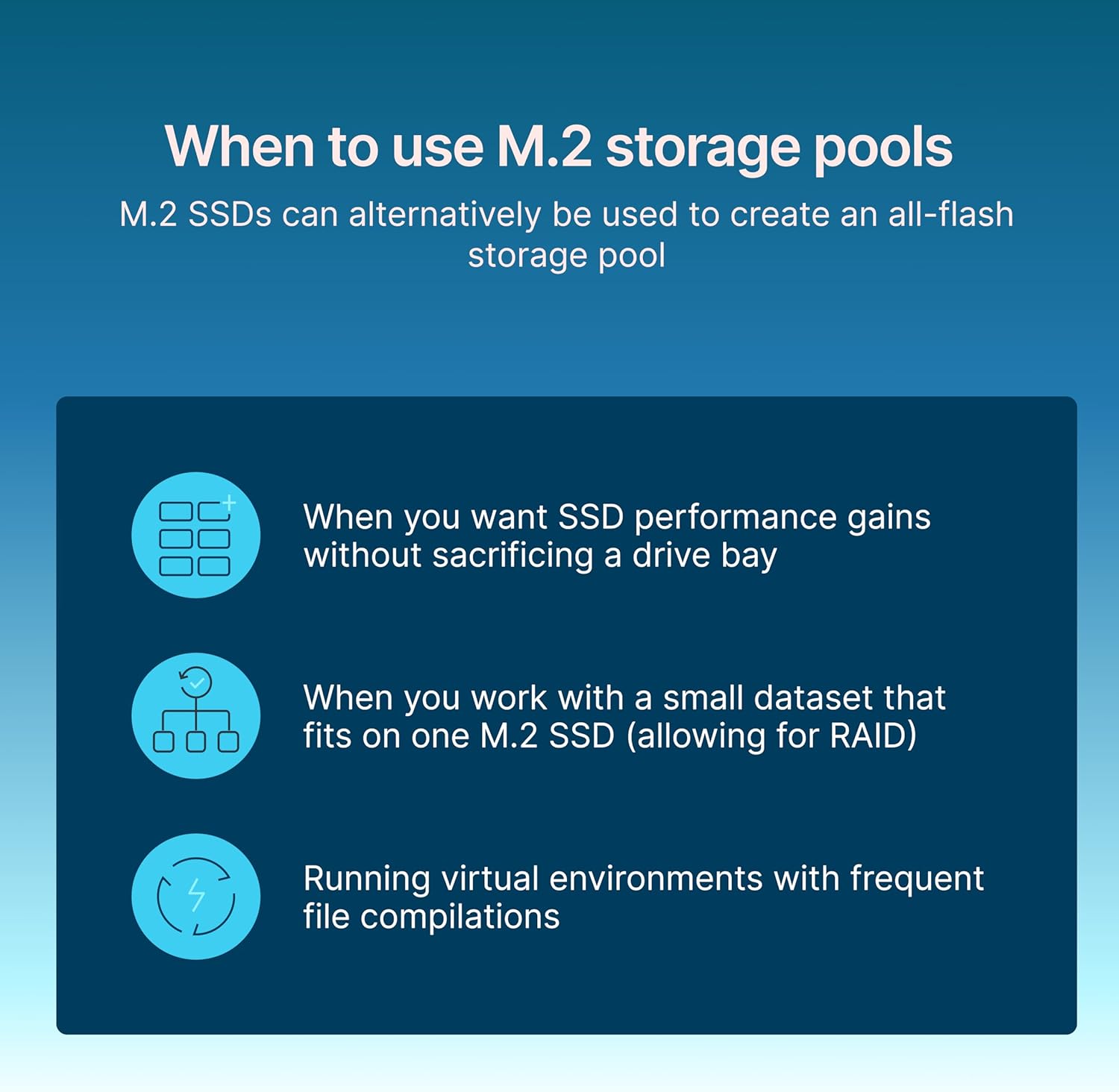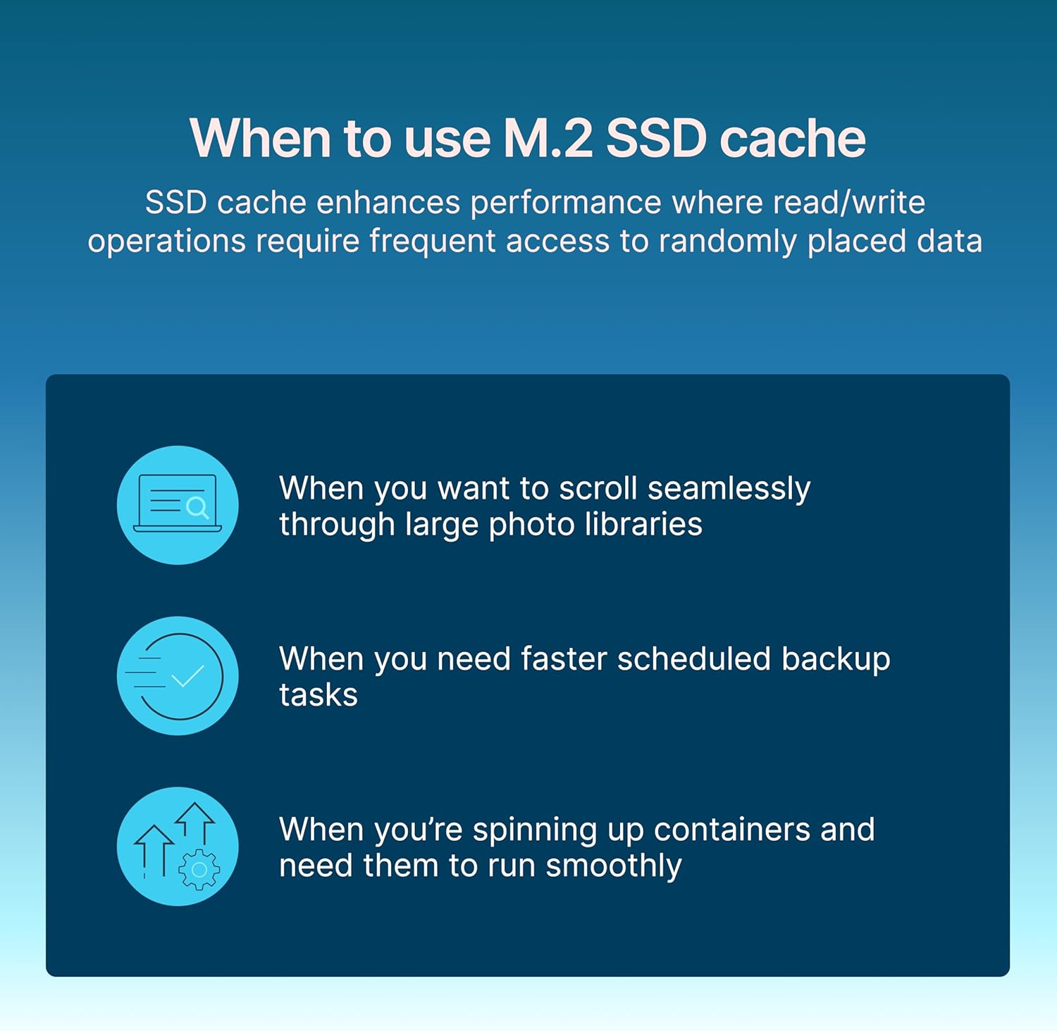 Synology Enterprise Series M.2 NVMe SSDs are designed to handle demanding caching workloads in 24/7 high-concurrency scenarios. Their strong sustained I/O performance makes them ideal for systems used as high – performance file servers, database storage, and virtualization environments. These drives feature advanced lifetime analytics and are backed by Synology’s 5-year limited warranty.