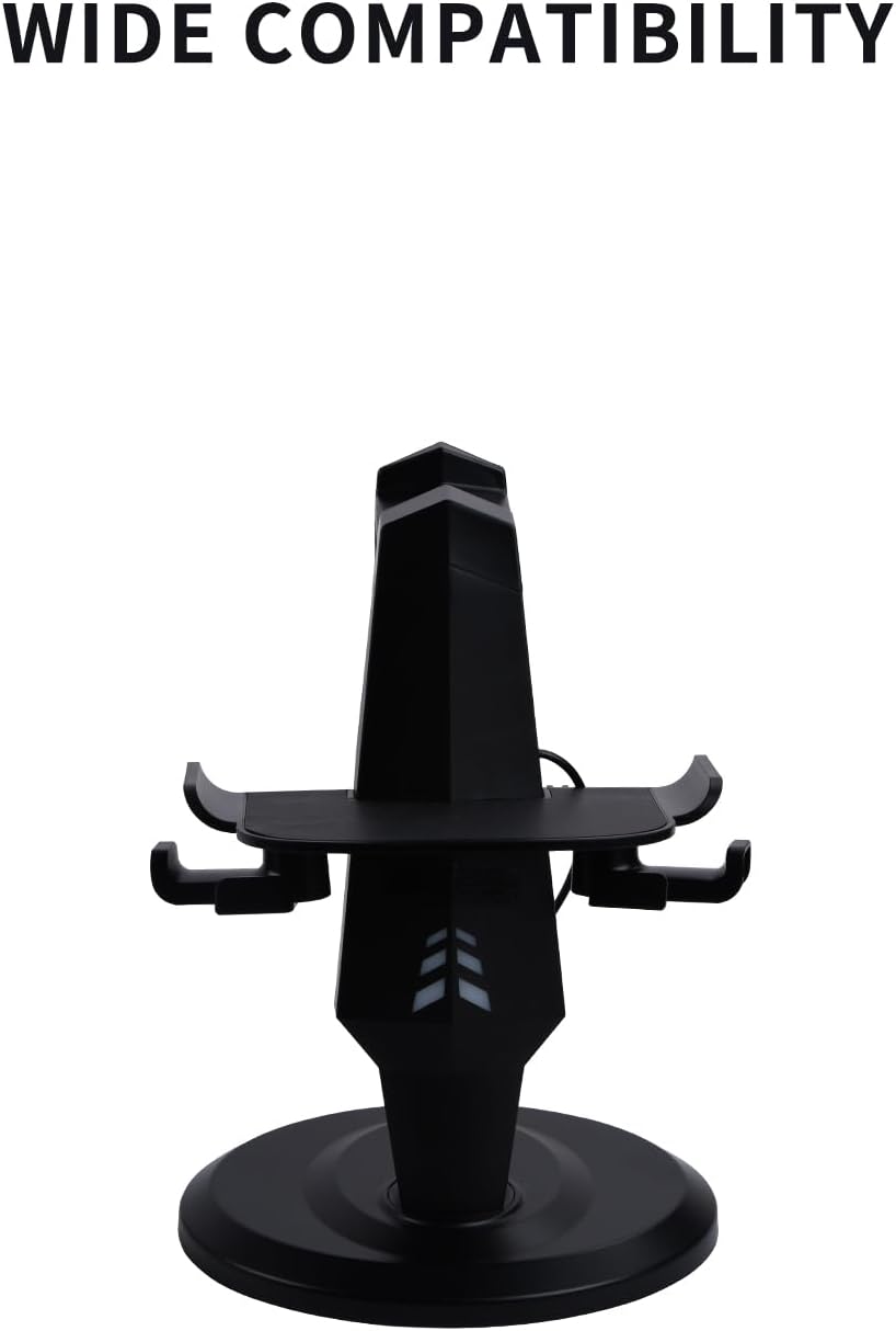 VR Stand with Rotatable Controllers Hanger and Earphones/Cable Organizer. Side hangers are very convenient to place 2 controllers and the hangers on the back provides a place for earphones/cables to meet your higher requirements on organizer