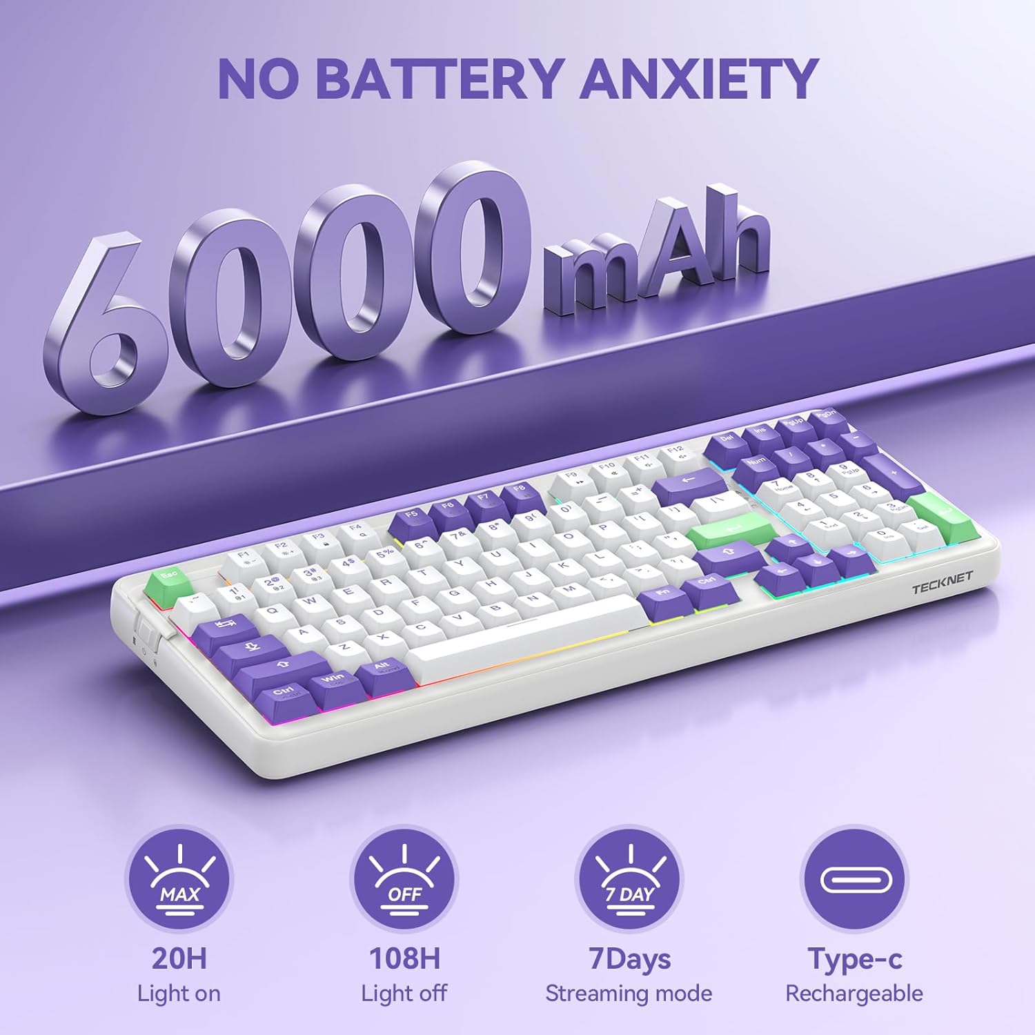 The 6000mAh lithium battery delivers 108 hours of continuous use. Activates ultra-low-power sleep mode after 1-minute idle—consumes 0.1mA. Recharge via side USB-C port while typing. No more “low battery anxiety” during tournaments.