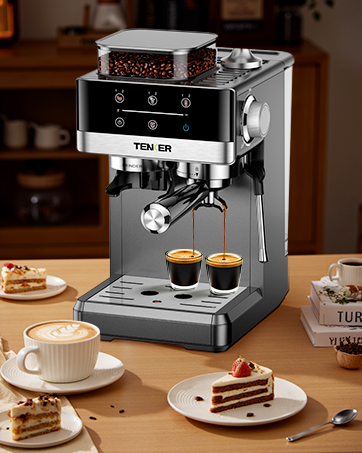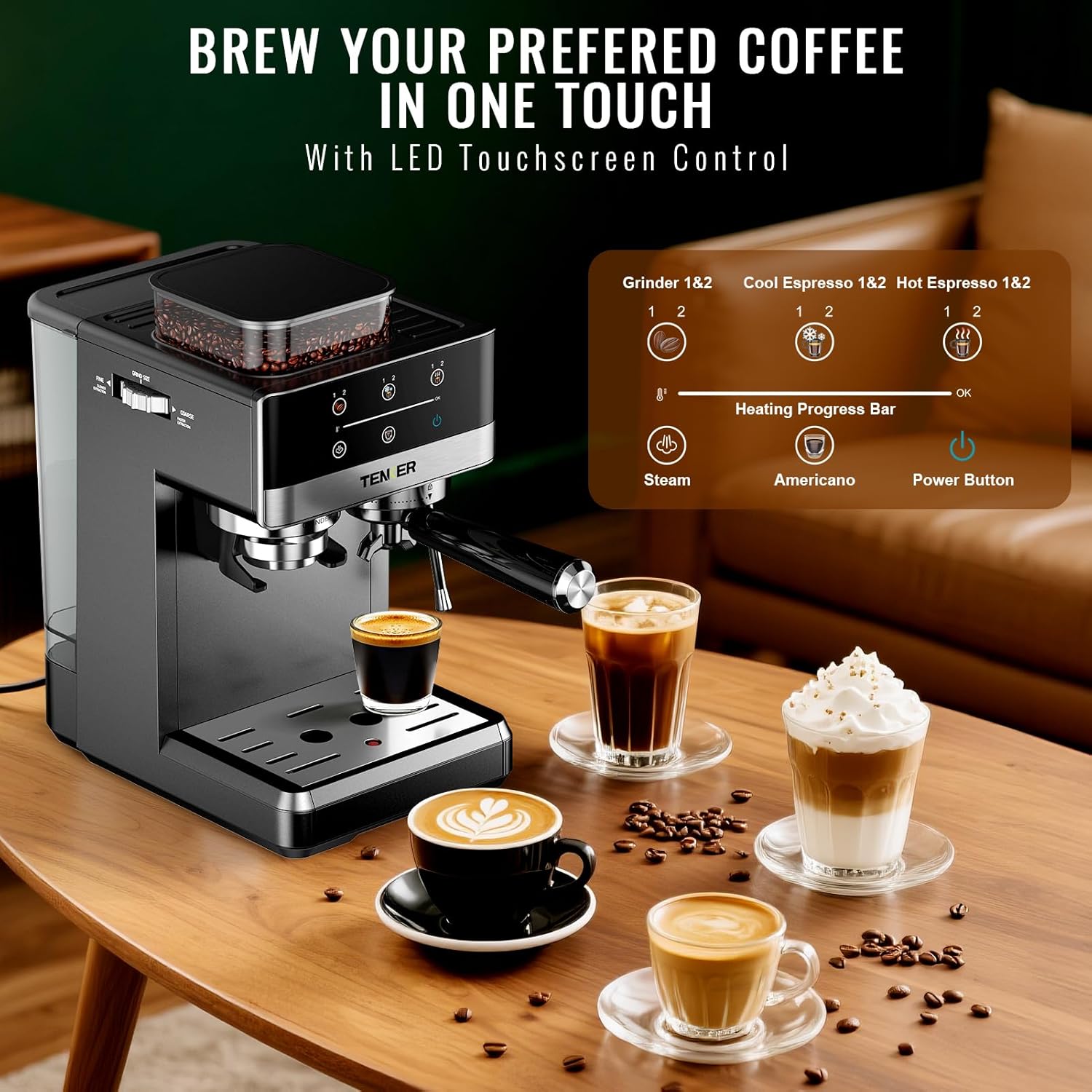 TENKER Espresso Machine with Grinder, 20 Bar Coffee Machine with Milk Frother for Home, All-in-One Stainless Steel Coffee Maker to Make Latte, Cappuccino, Hot or Cold Brew Iced Coffee