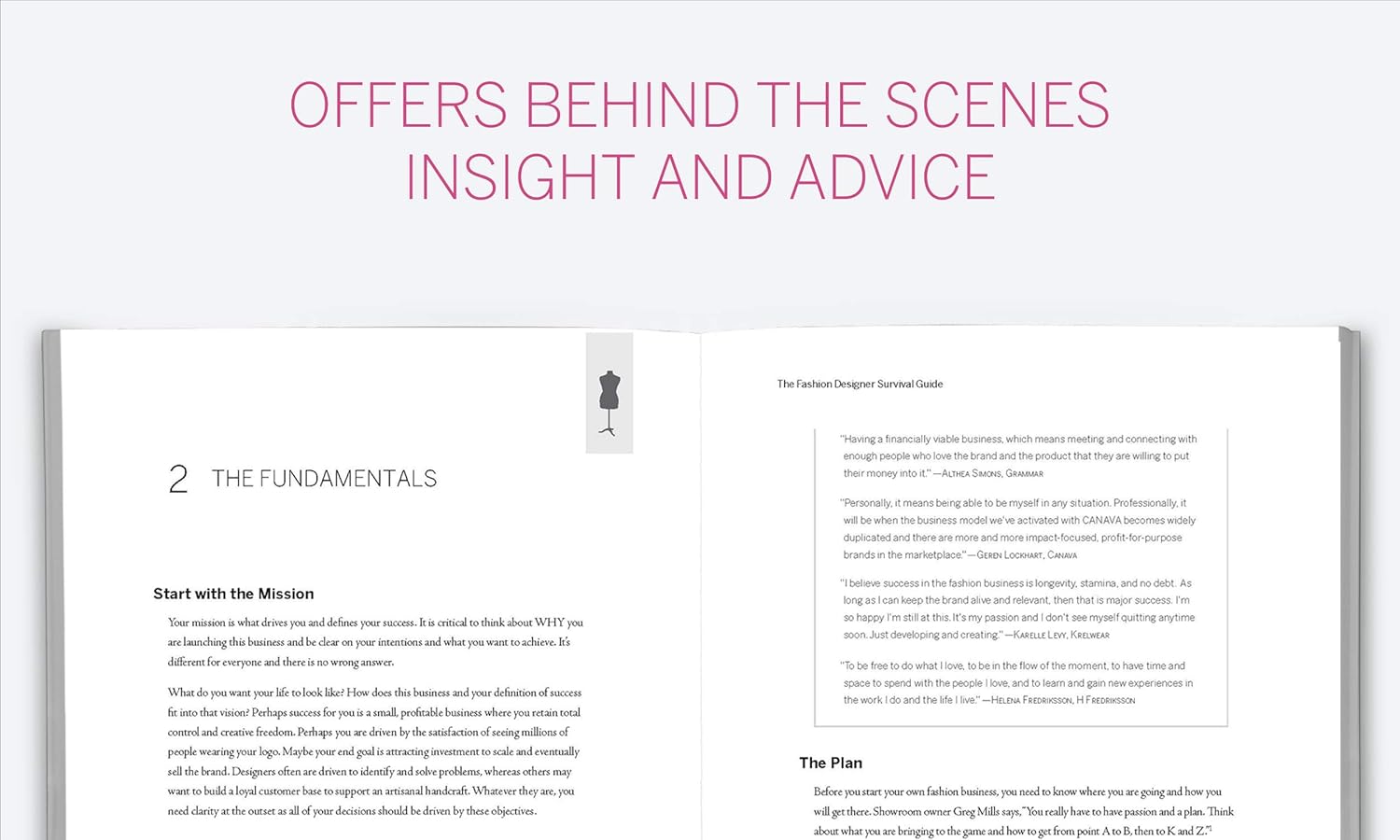 “The Fashion Designer Survival Guide is packed with essential knowledge and advice from industry experts and experienced designers to set you on the right path. These insights will give you the solid foundation to create a plan and make smart decisions…” Christian Siriano