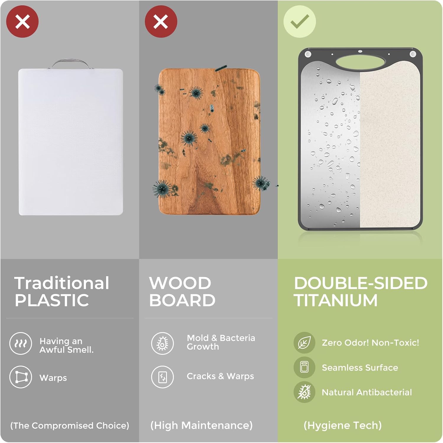 Unlike wood boards that absorb odors or plastic boards that stain, our titanium and wheat straw combo offers a cleaner, more sustainable solution.