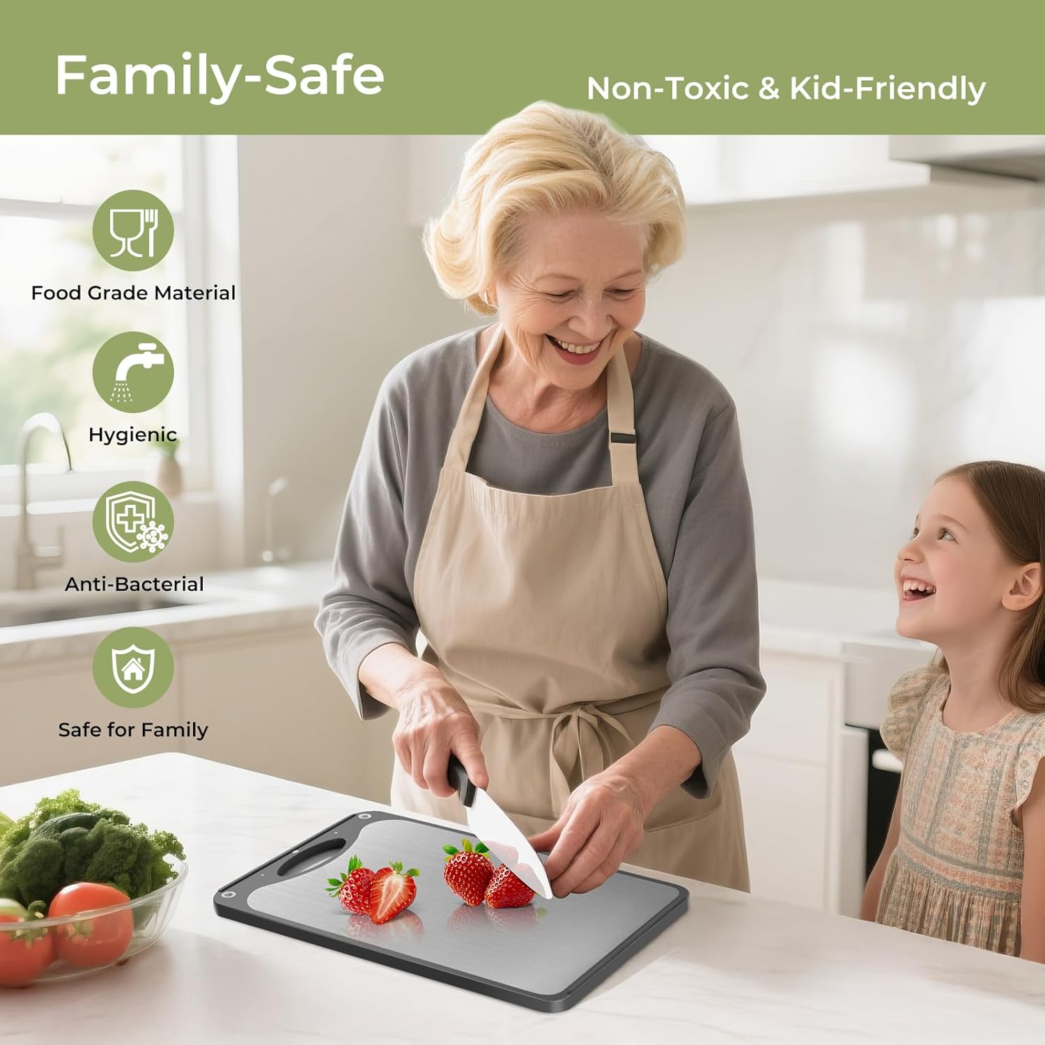 DOUBLE-SIDED DESIGN FOR HYGIENIC FOOD PREP: One side of this titanium cutting board features a sleek Pure Titanium surface, ideal for meats and juicy foods thanks to its non-porous, easy-clean nature, while the other is made of natural wheat straw PP perfect for fruits, veggies, and bread. Keep your kitchen organized and avoid cross-contamination with this smart two-in-one solution