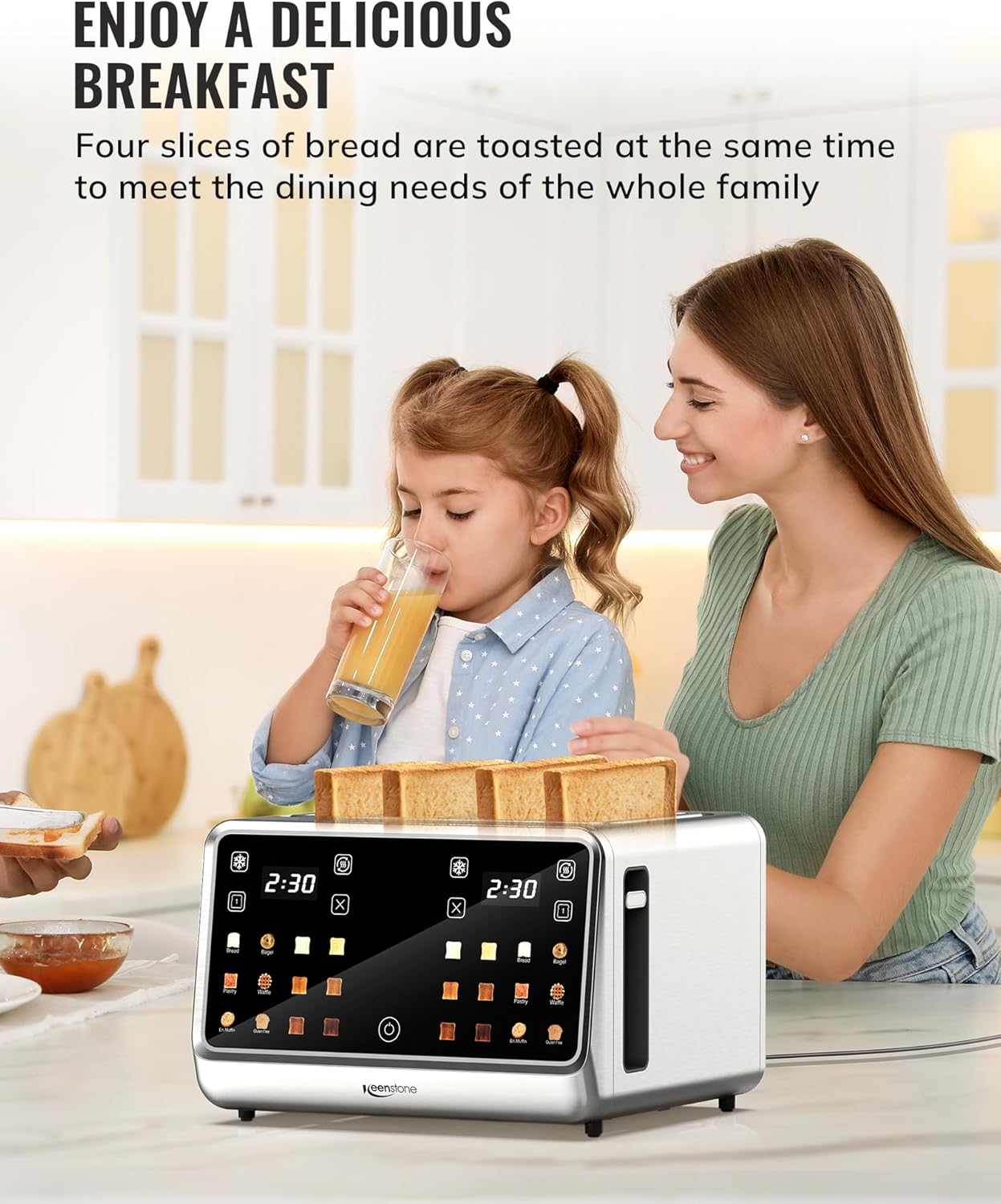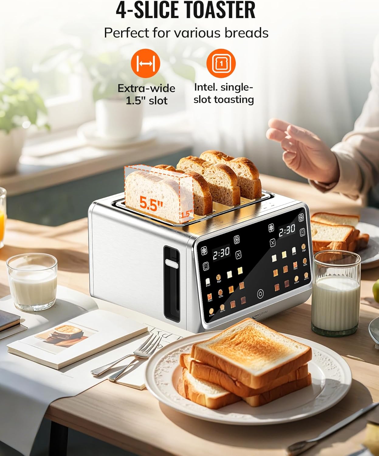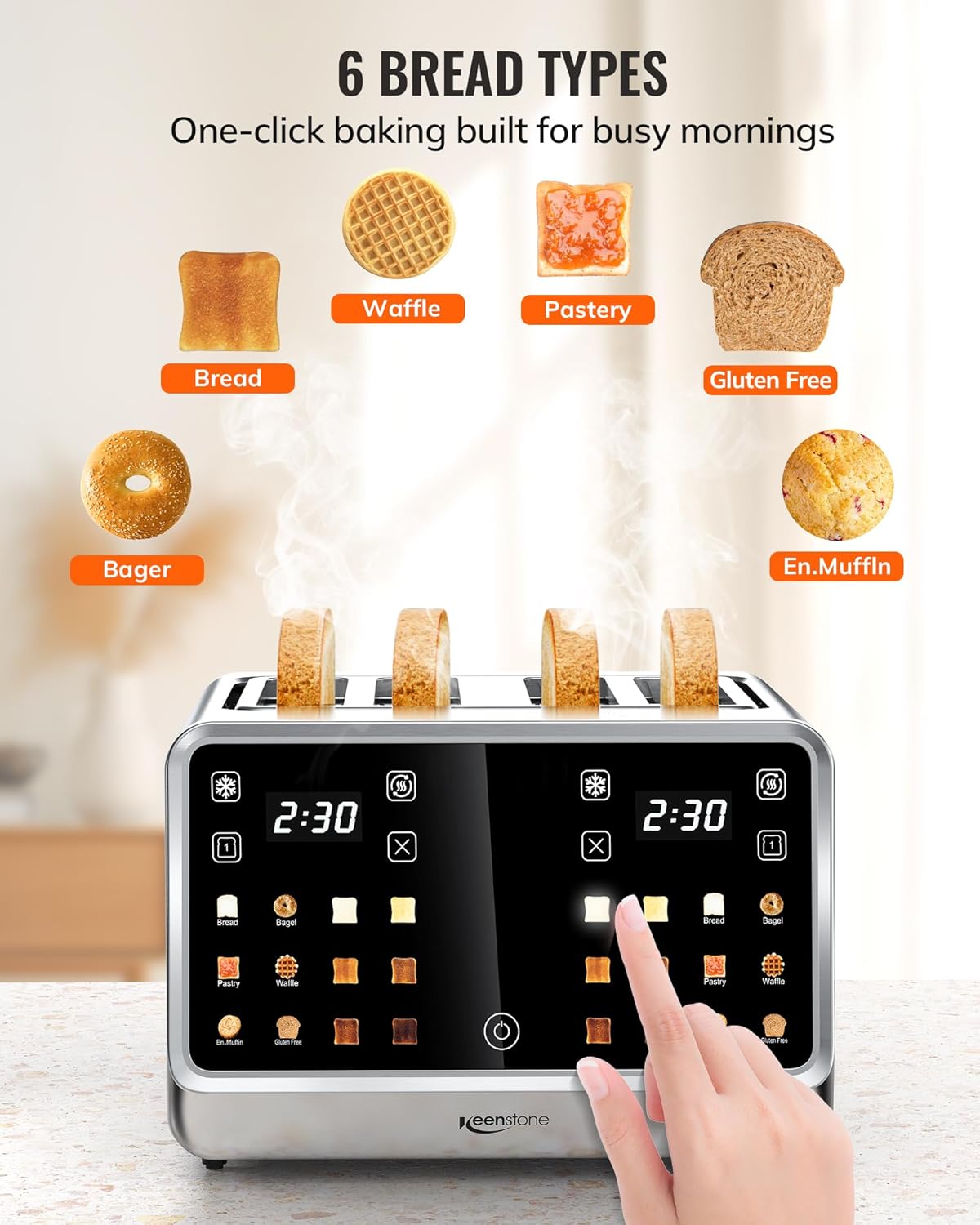 【TiltControl Touchscreen】 Operate the toaster without bending. The 75° angled screen with large icons lets you easily select from 6 browning levels and bread types while standing. A user-friendly design for a faster morning routine.