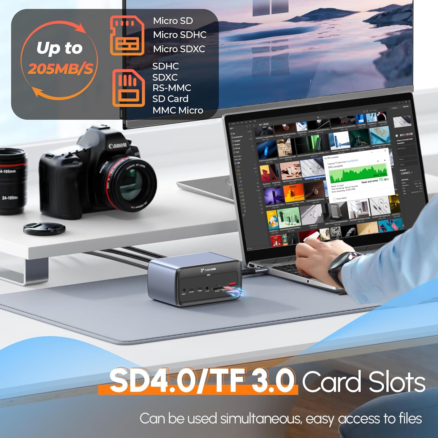Built-in 100W GaN III Charger: Equipped with an independent 100W GaN III charger, the laptop docking station delivers up to 87W to your laptop via USB-C PD 3.0 and 20W to phones/tablets through the front USB-C port. Gallium Nitride (GaN) tech ensures safer, more stable charging for the dock and laptop, eliminating the need for an extra laptop power supply