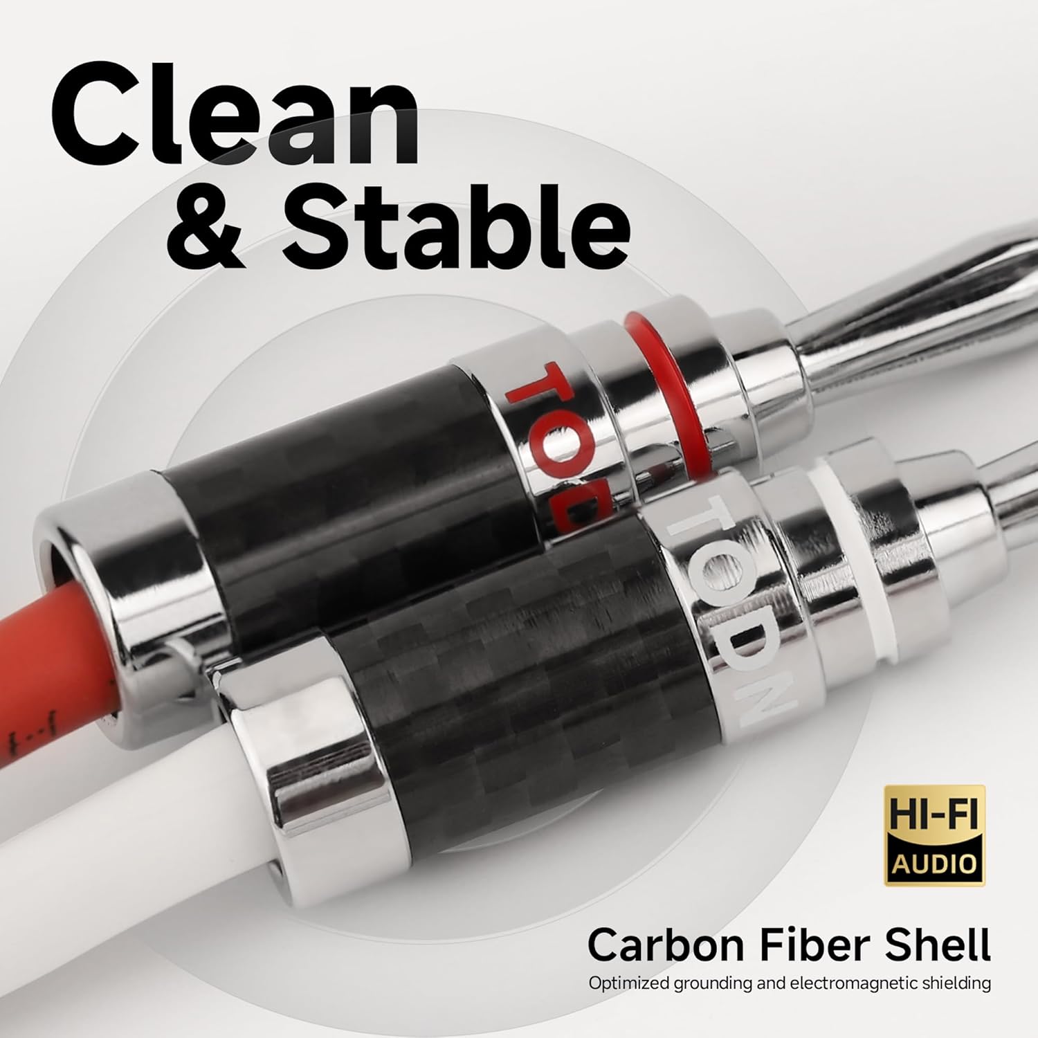 Plugs without Buzz: TODN speaker cord with banana plug features with 4 rhodium-plated banana to banana plugs ensuring a secure, corrosion-resistant connection with smooth insertion.The embedded carbon fiber on shells adds further protection against interference.
