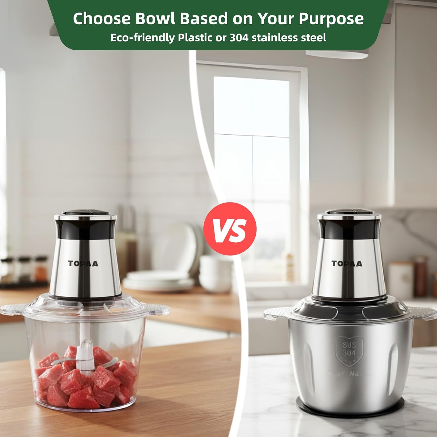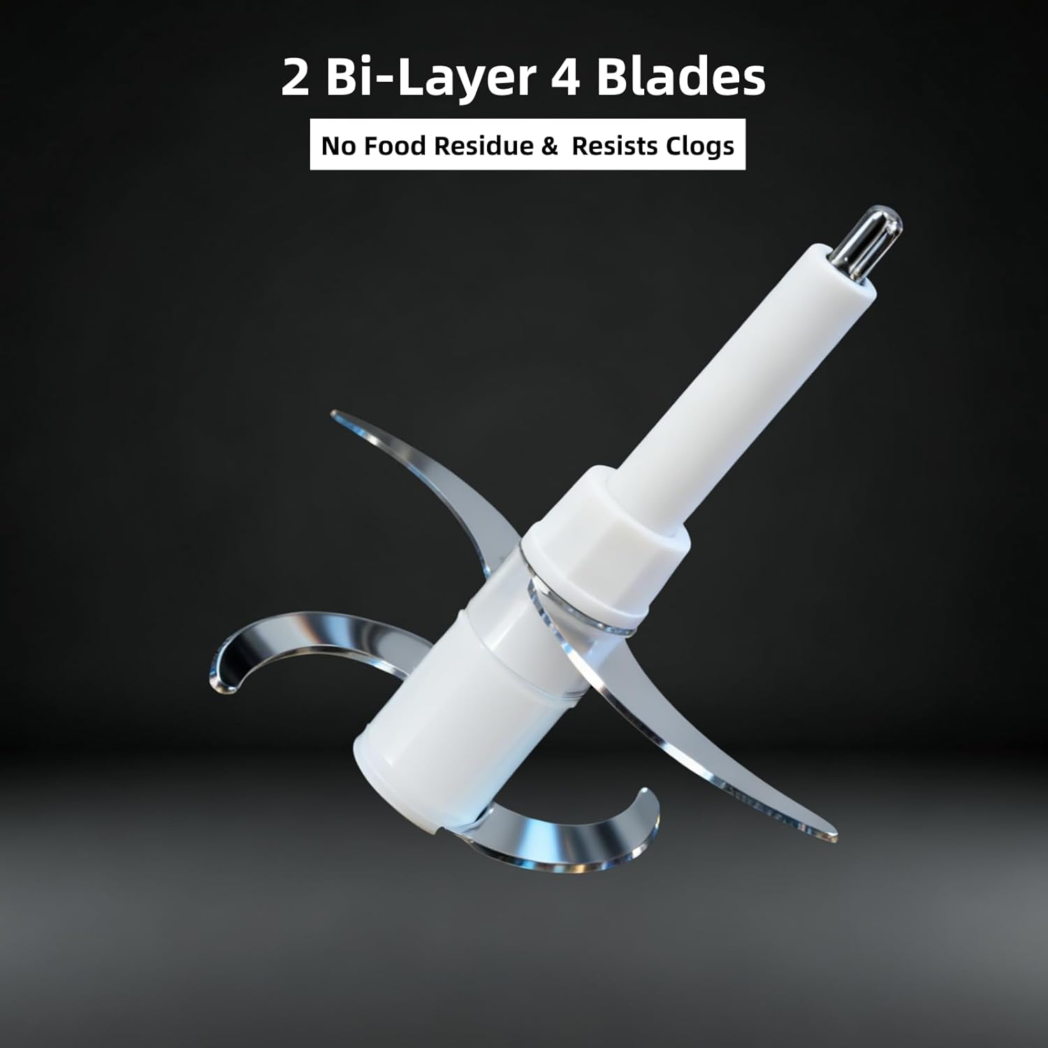 【Dual Blades &Bowls】 Includes 2 sets of integrated stainless steel blades – no assembly required,resists meat jams.Comes with 2x 12-cup containers: durable PET bowl (far more durable than glass) + food-grade SUS304 stainless steel bowl.Safely processes meats, vegetables, nuts, and frozen fruits,.Ideal for making salads, dips, and meal prep ingredients Compact design perfect for daily kitchen use