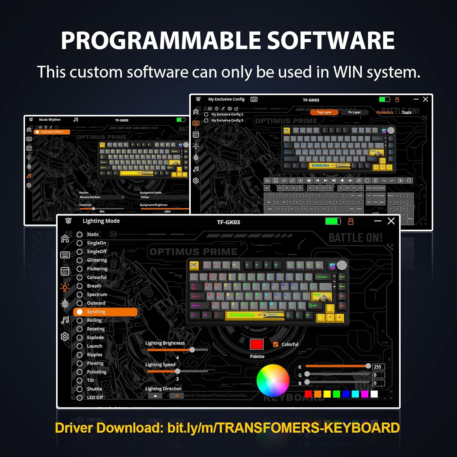 Our Transformers-themed keyboard with RGB lighting from Transformers battle masks on the knob, and the Multimedia knob module is interchangeable with the “Print” and “Pause” keys (Grab the knob and pull out the module)
