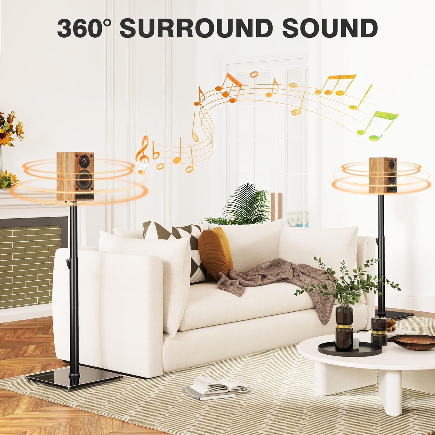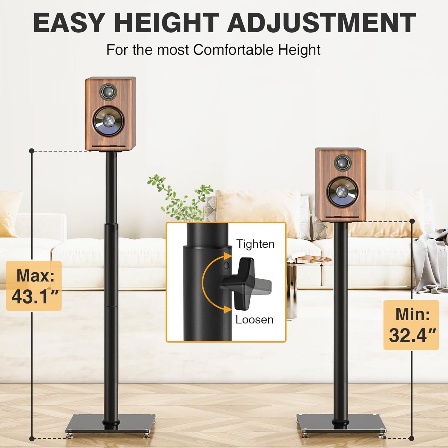 Height Adjustable – The speaker stands with extendable tube allow to adjust the height from 32″ to 43″, which helps you create the best listening height at different heights to get the best sound from your speakers. At the same time, the speaker mount pair has a 360° rotating top plate that allows you to fine-tune the orientation of the speakers, bringing them closer to your ears for the best listening experience and giving you a purer and more clear sound.