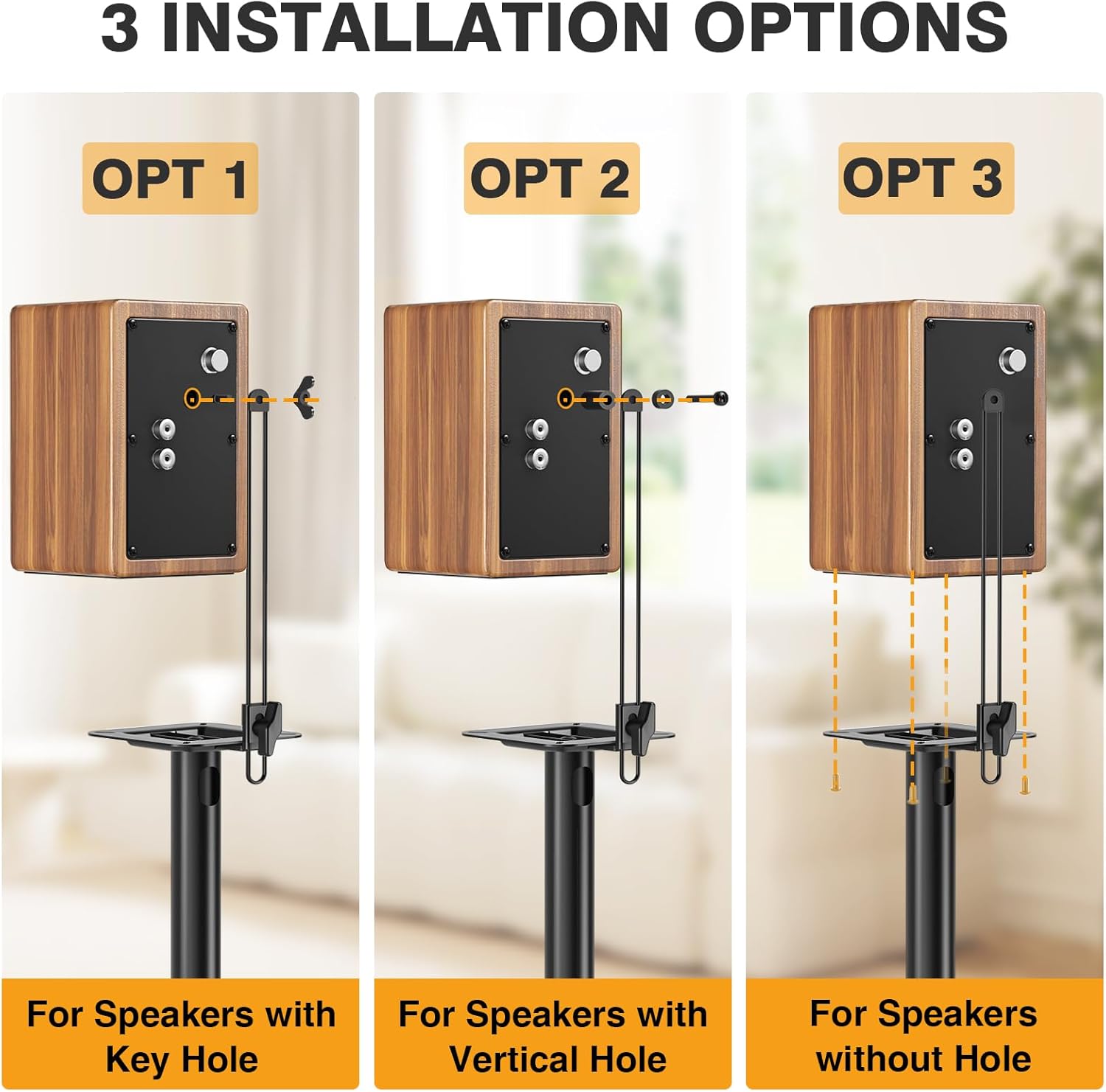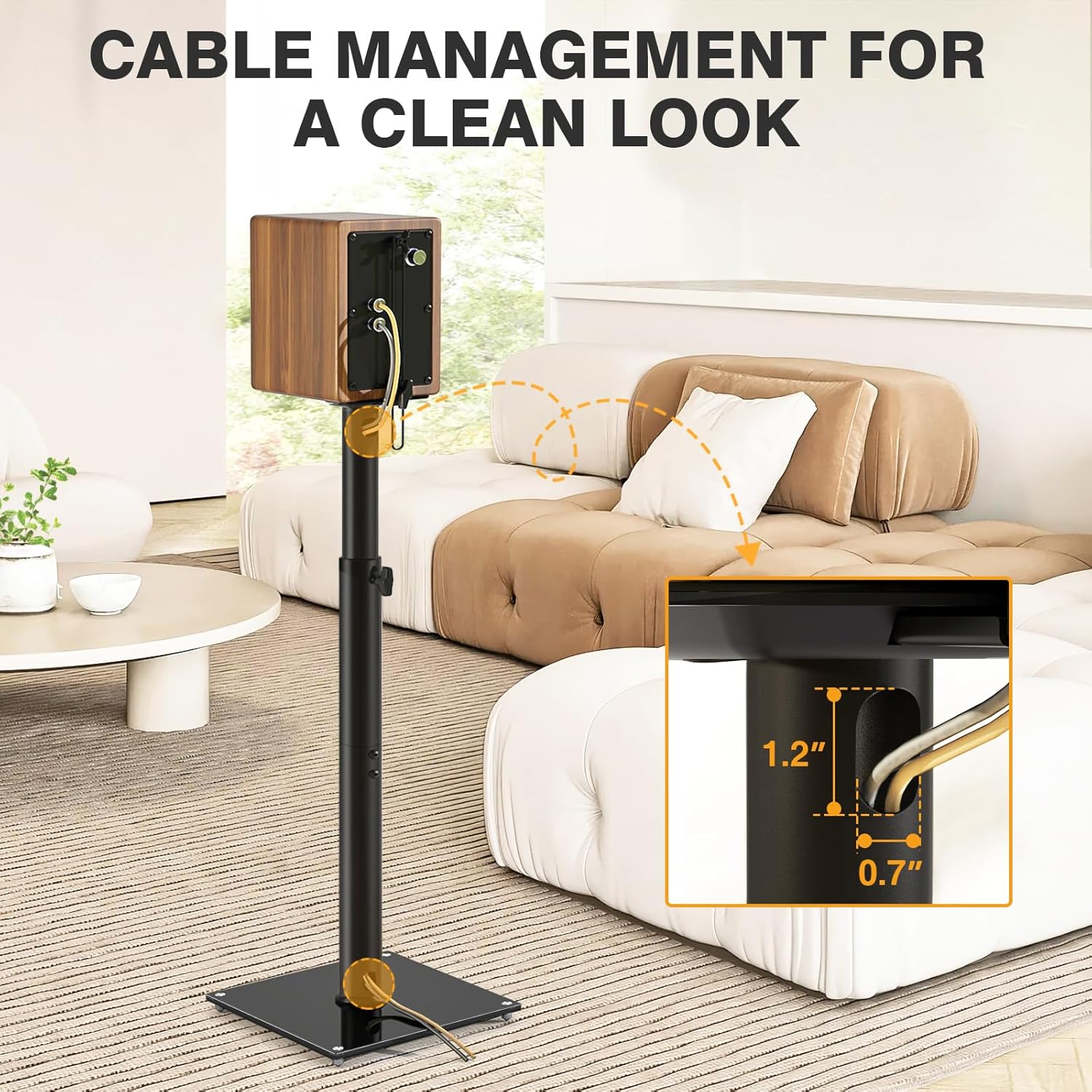 Cable Management: Say goodbye to tangled cables with the cable management feature of our speaker mounts. The loudspeaker has a large hole of 1.2″H x 0.7″W for storing the loudspeaker cable. Run the cable through the hollow center of the steel pole, leaving your speaker cables neatly organized and protected. Enhance your living space with our elegant and versatile speaker stand design that seamlessly blends with any home decor.