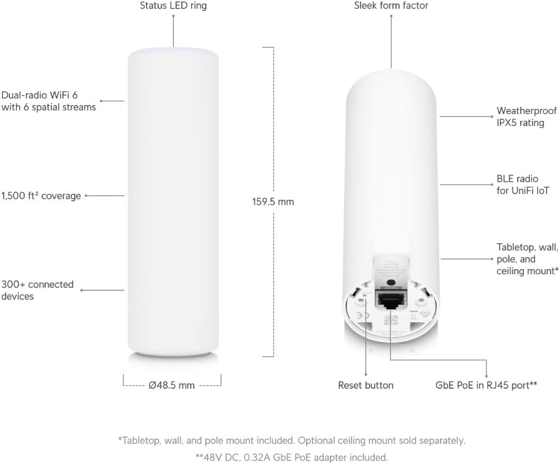Ubiquiti Unifi Wi-Fi 6 Mesh AP 4×4 Mu-/Mimo Wi-Fi 6, 2.4Ghz @ 573.5Mbps & 5GHz @ 4.8Gbps, PoE Injector Included