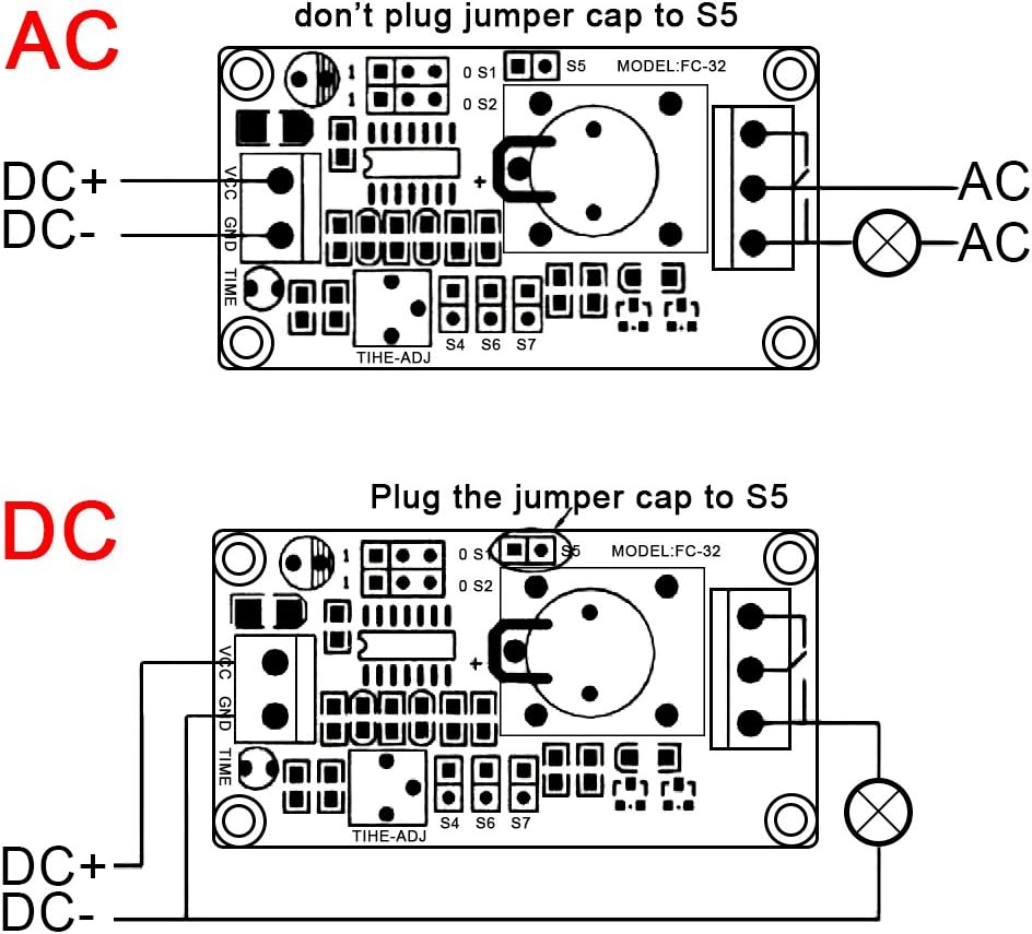 Short S6, open S7, delay turn offShort S7, open S6, delay turn onTips: When controlling AC current or DC voltage that is not 12V, please remove the jumper cap of S5, otherwise the module will be burned or will not work properly.