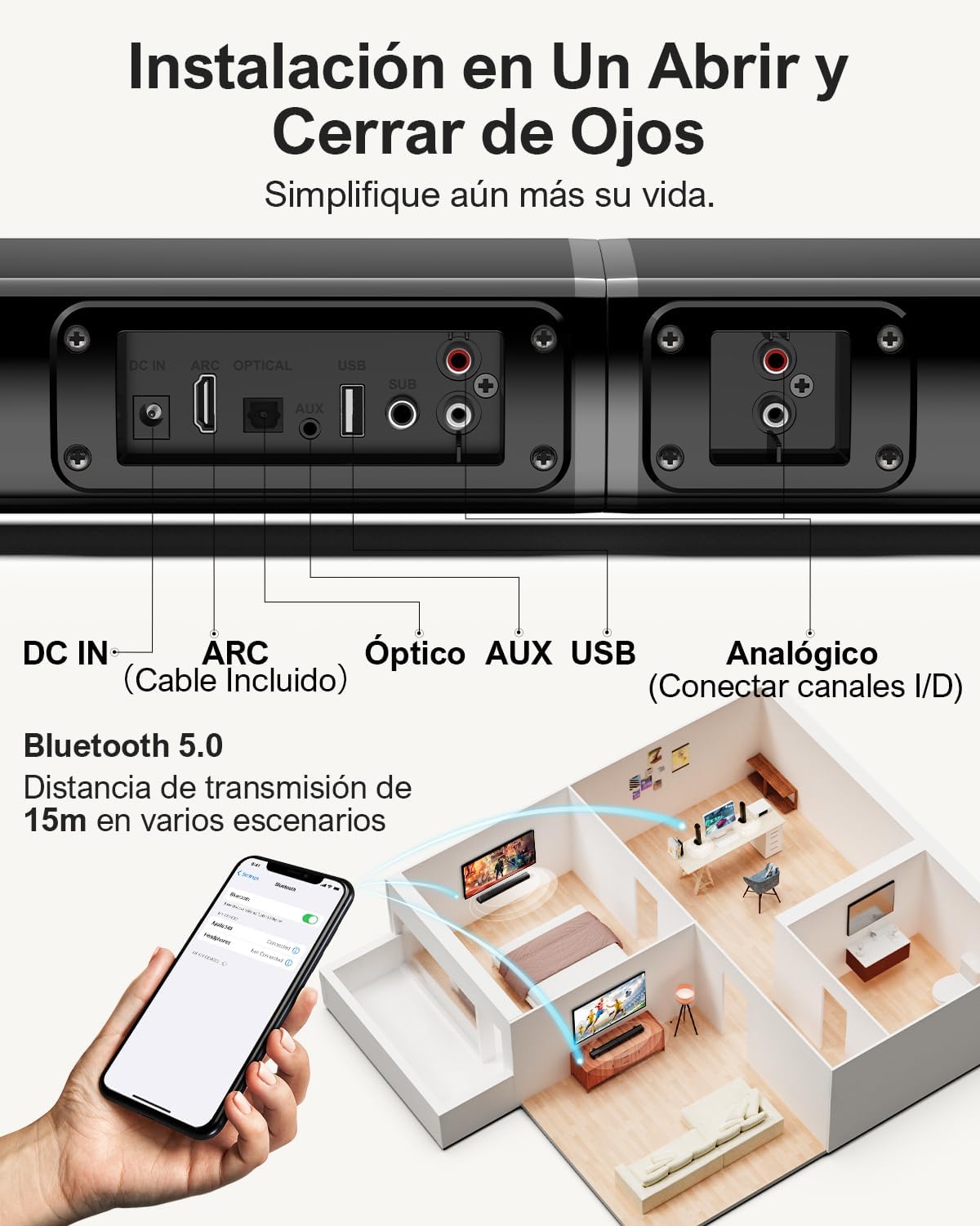 Seamless Connectivity – This sound bar for smart tv has wired and wireless dual connection options, including HDMI ARC, Optical, AUX, and USB ports (all cables included). Bluetooth 5.3 technology ensures faster speeds and a coverage range of up to 49 feet.